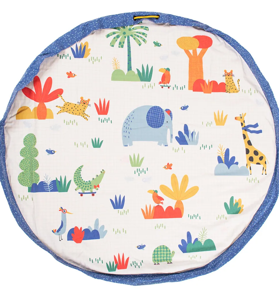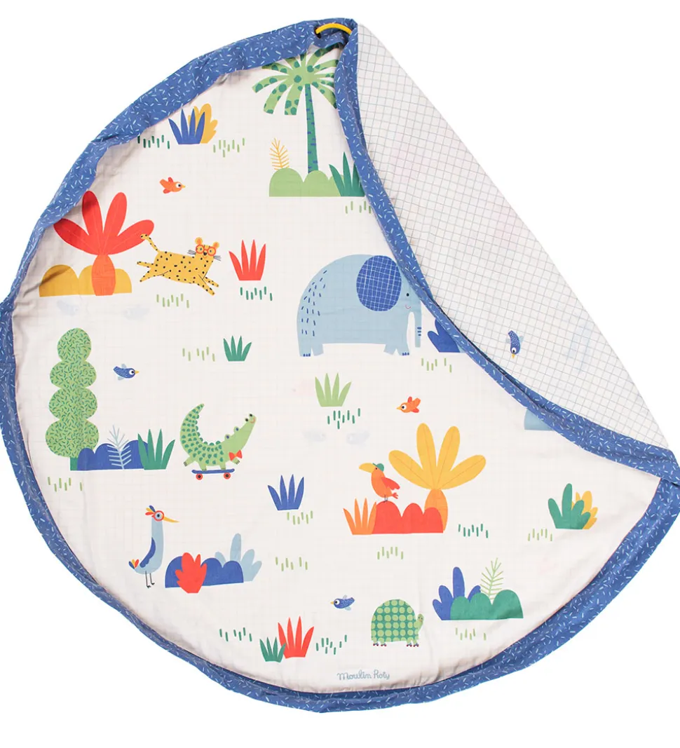 Flot Play&Go x Moulin Roty legetøjstæppe i hvid med blå kanter og med forskellige print på inder- og ydersiden. Indersiden har et farverigt pint af savannedyr, planter og træer, mens ydersiden har et blåt, fint ternprint og små fugle.
