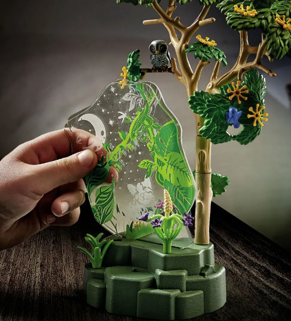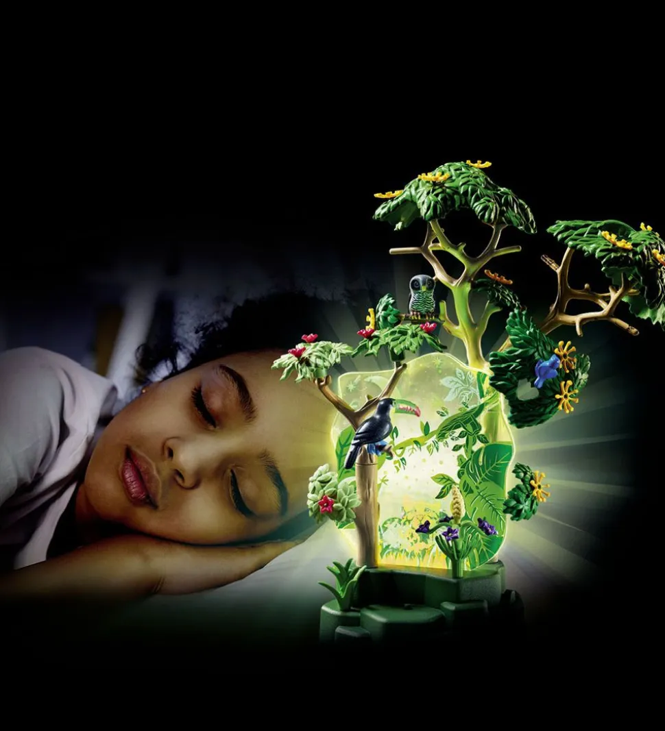 Lærerigt Playmobil Wiltopia sæt med en flot regnskovs-natlampe med hyggeligt lys og regnskovslyde (4 x AAA-batterier påkrævet, ikke inkluderet). I sættet er der også to figurer og flere fugle, bl.a. en lille model af en tukan, samt tilbehør – i alt 69 dele.