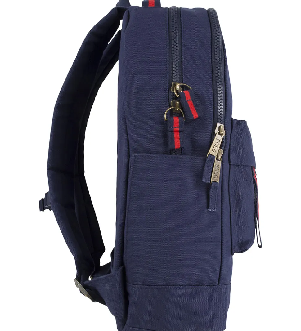 Polo Ralph Lauren rygsækken åbnes i toppen med en lynlås med to skydere, og den består af ét stort rum med et navy, glatvævet for. Ind mod ryggen er der en lomme med elastikkant til f.eks. en bærbar computer. Udenpå er der endnu et rum, som åbnes med en lynlås med to skydere, og der er små lommer og elastikbånd til opbevaring af diverse småting. Fortil sidder der et mindre rum, som lukkes med en skjult lynlås, og i hver side af rygsækken sidder der en mindre, åben lomme til f.eks. en drikkedunk.