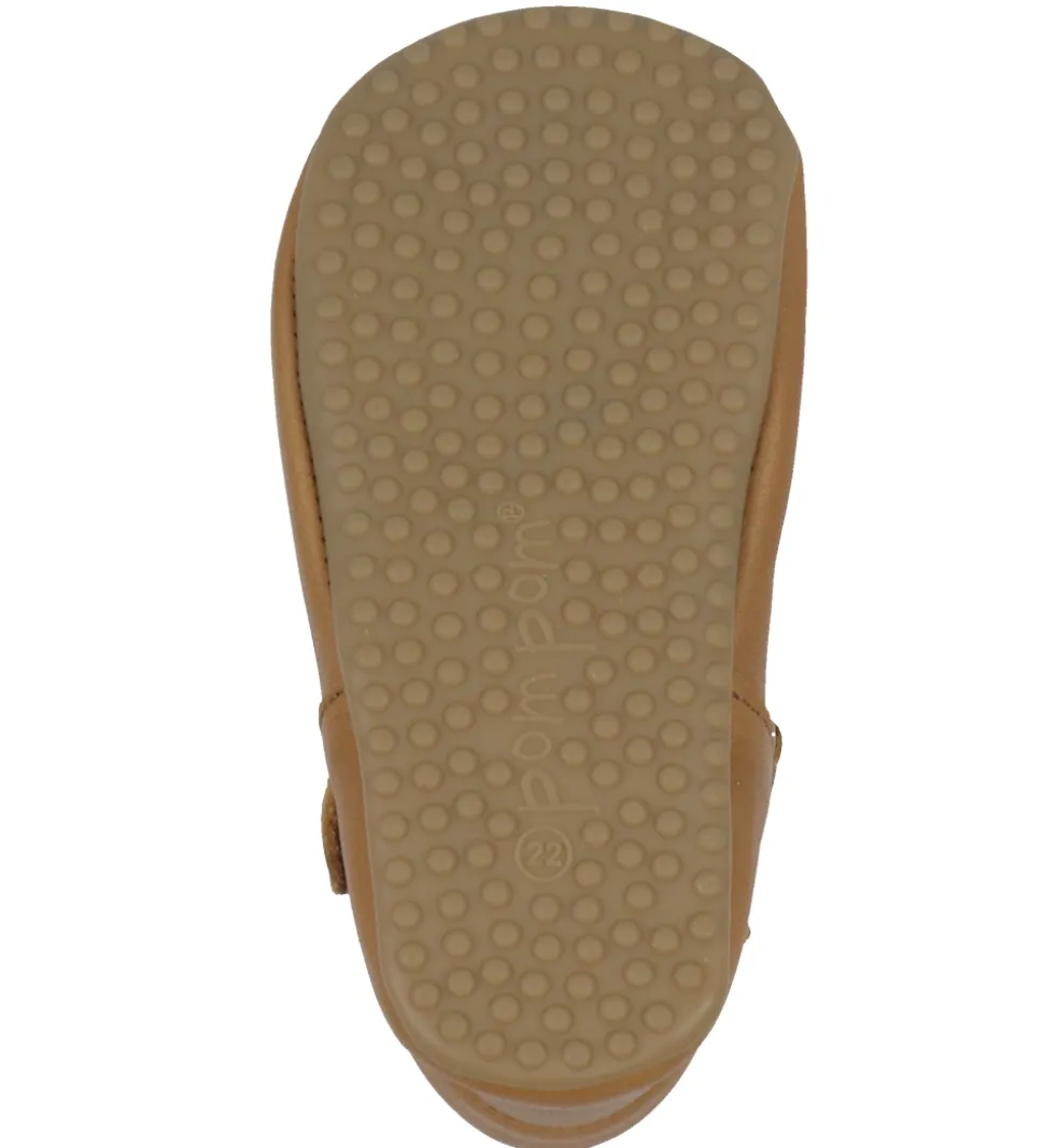 Pom Pom hjemmeskoene lukkes med en smal velcrorem foran anklerne. På indersiden er der blødt skind, og ydersålerne er lavet af gummi med små knopper, som giver et godt fodfæste.