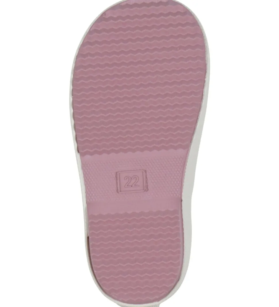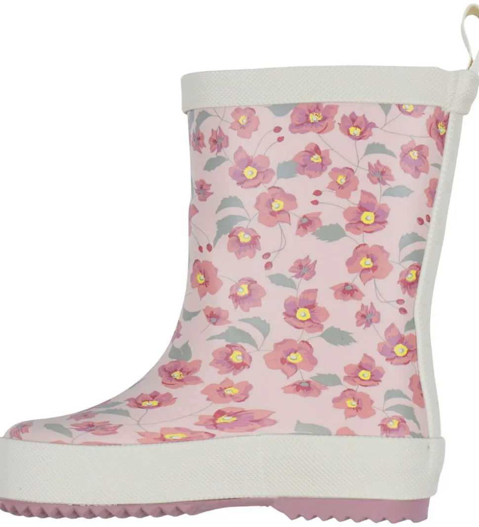 Fine Pom Pom gummistøvler i lys rosa med print af blomster i rosa, gul og grøn. På ydersiden er der et rundt logo.
