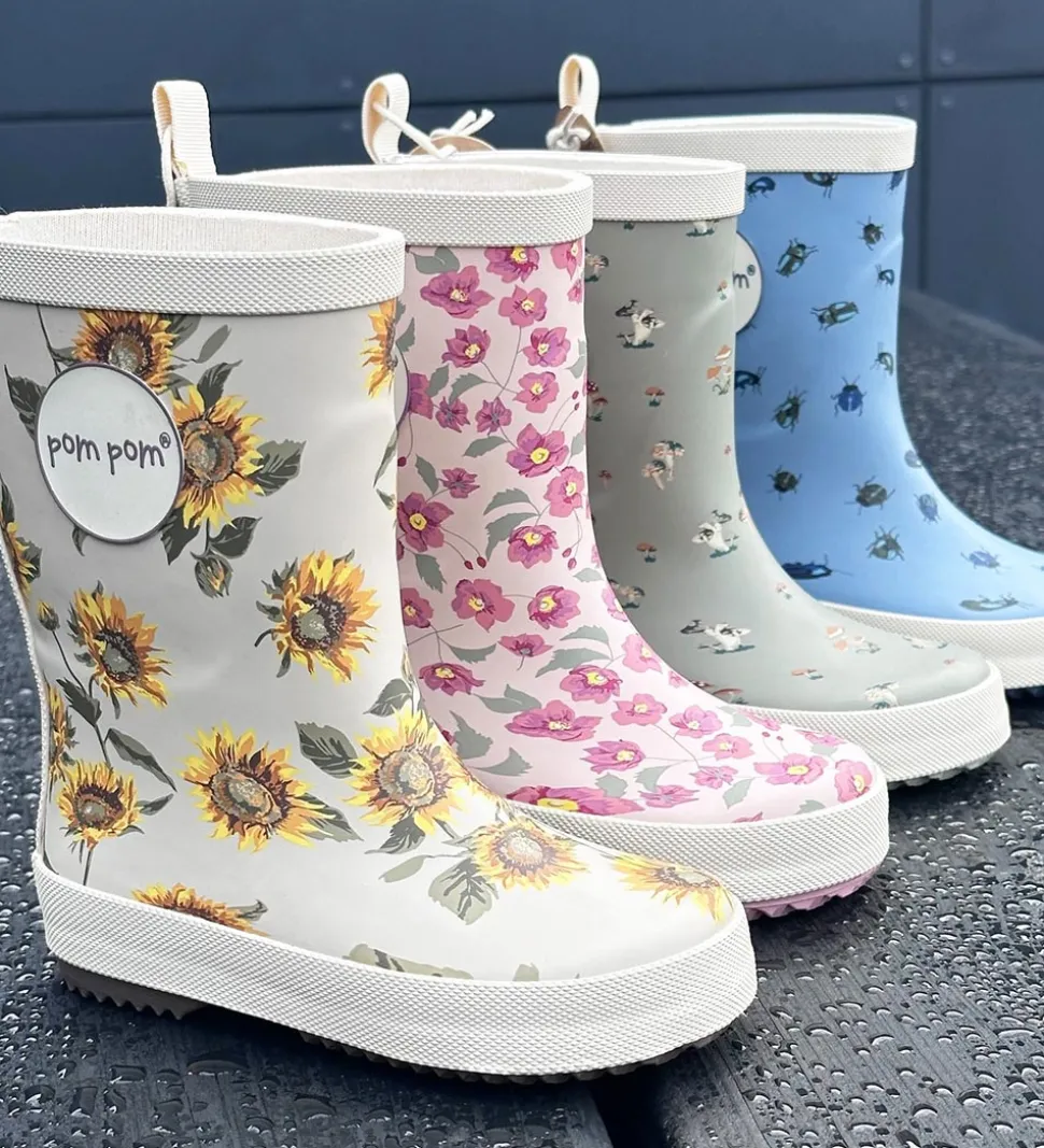 Pom Pom gummistøvlerne har et mellemhøjt skaft med en strop bagpå, så de er lette at få på. Indvendigt er der tekstil og udtagelige indersåler. Gummistøvlerne er meget fleksible med et skridmønster under bunden, som sikrer et godt fodfæste.