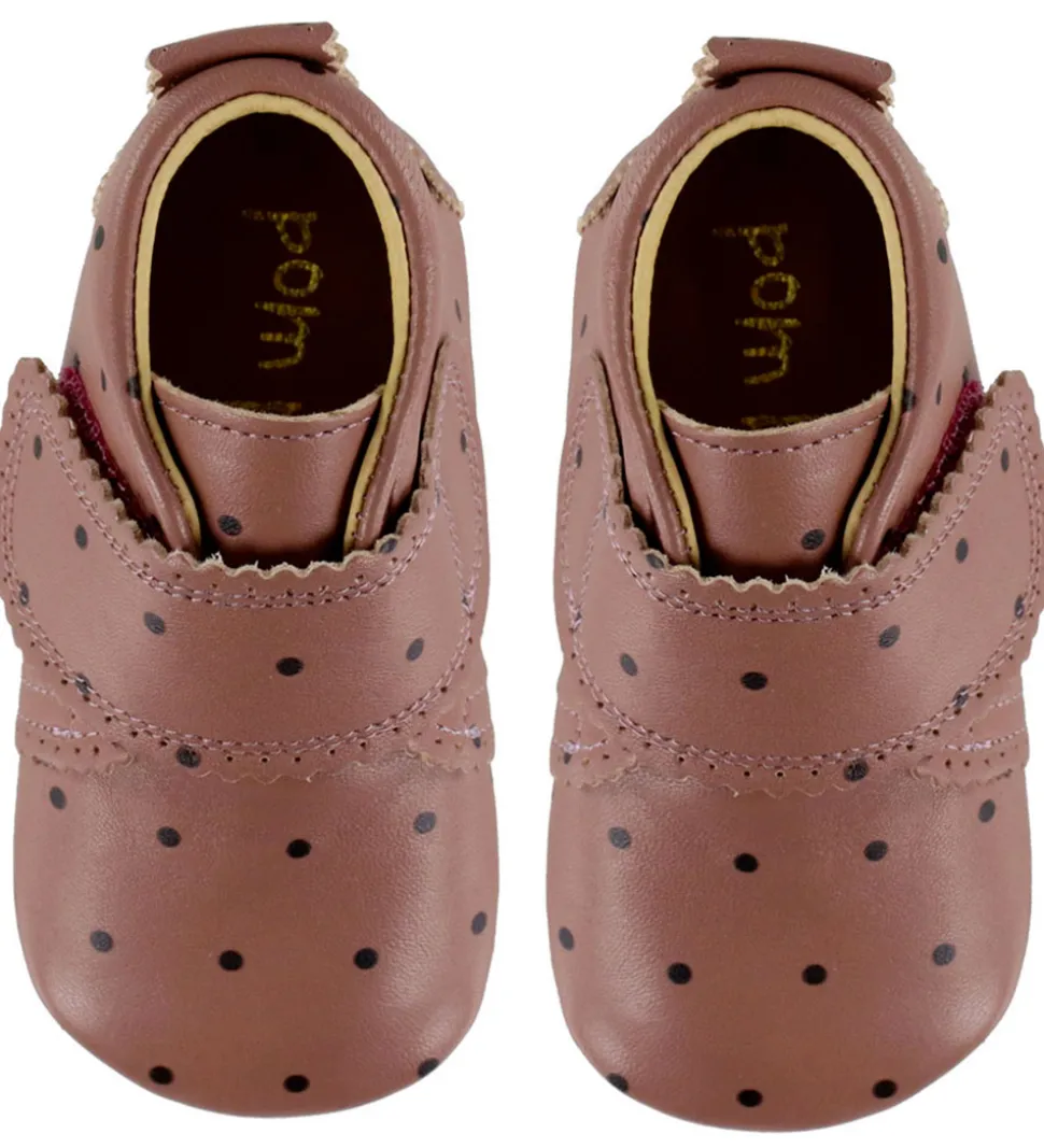 Pom Pom skindfutterne er lavet i blødt læder, der giver en fleksibel sko, som ikke klemmer, og åbnes over vristen med en bred velcrorem. Indvendigt er de forede med læder, og indersålen er i en blød skindkvalitet og er udtagelig.