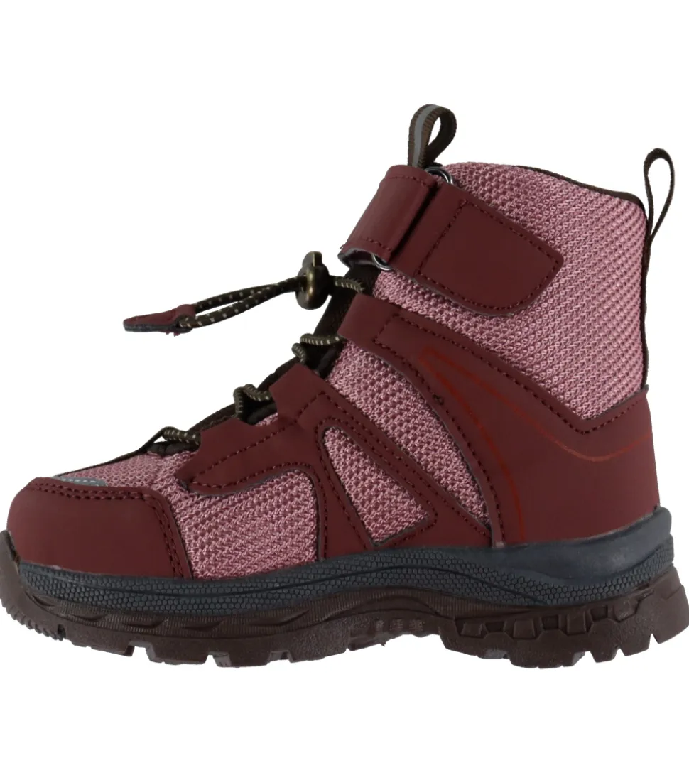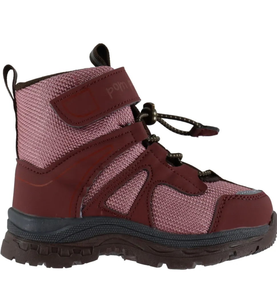 Pom Pom vinterstøvlerne har et mellemhøjt skaft, der går op over anklerne. De strammes fortil med elastiske snører og et spænde, lukkes øverst med en velcrorem og har desuden en praktisk strop bagtil, som gør det nemt at få dem på. Vinterstøvlerne har en støttende hæl- og tåkappe, som giver fødderne god støtte og stabilitet. Indvendigt er der hvidt velour og udtagelige indersåler.