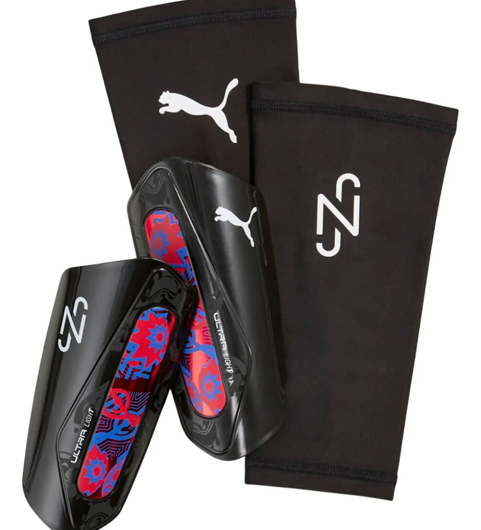 Seje Puma benskinner i sort med skinnende print i rød og blå. Benskinnerne er letvægtige og der medfølger to sleeves med hvidt logoprint og Neymar Jr. logo. Benskinnerne sættes let fast under sleevesene og beskytter skinnebenene under fodboldkampene.