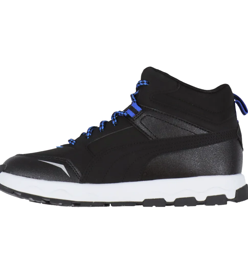 Flotte Puma støvler i sort imiteret læder og tekstil med blå detaljer.