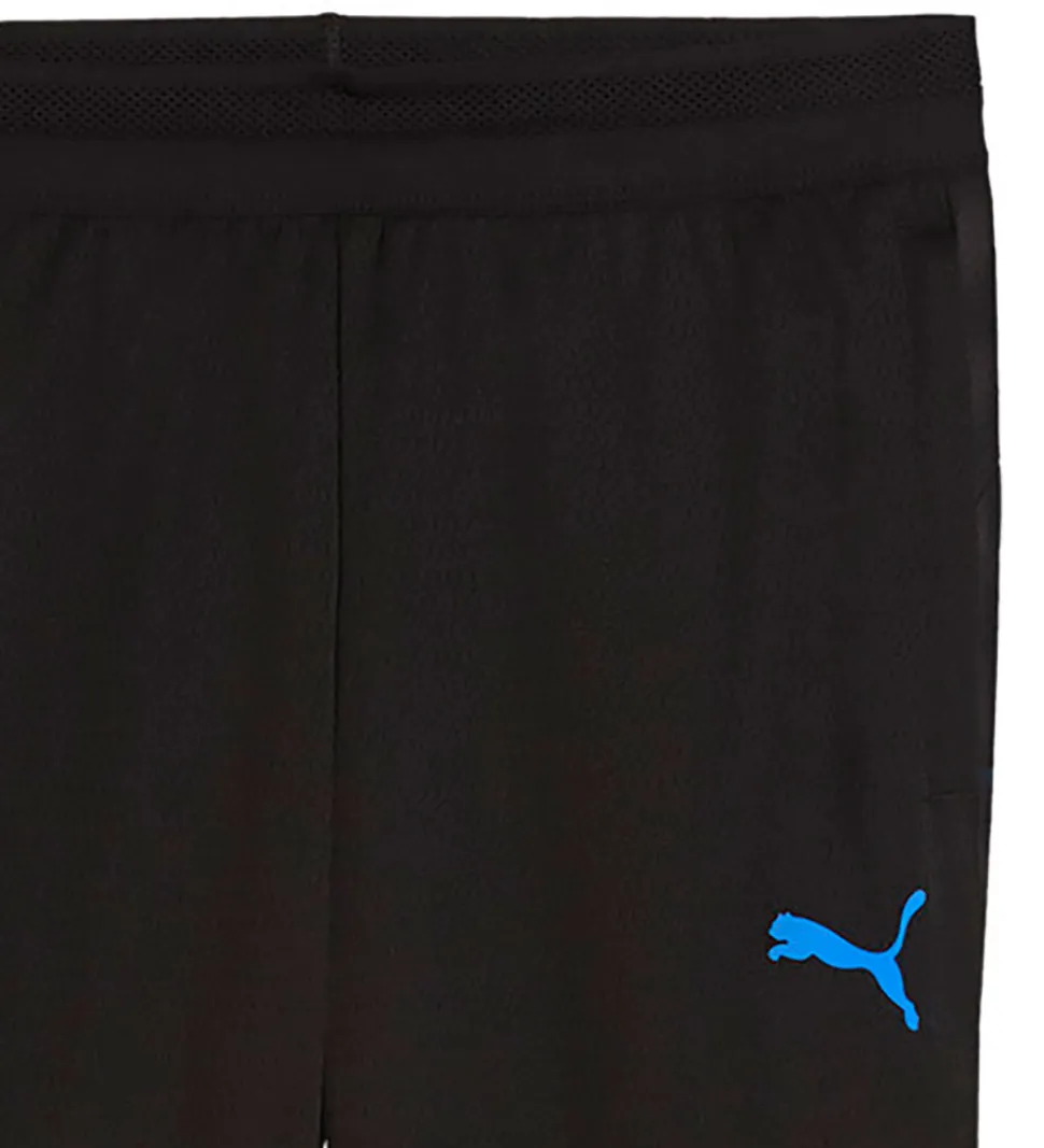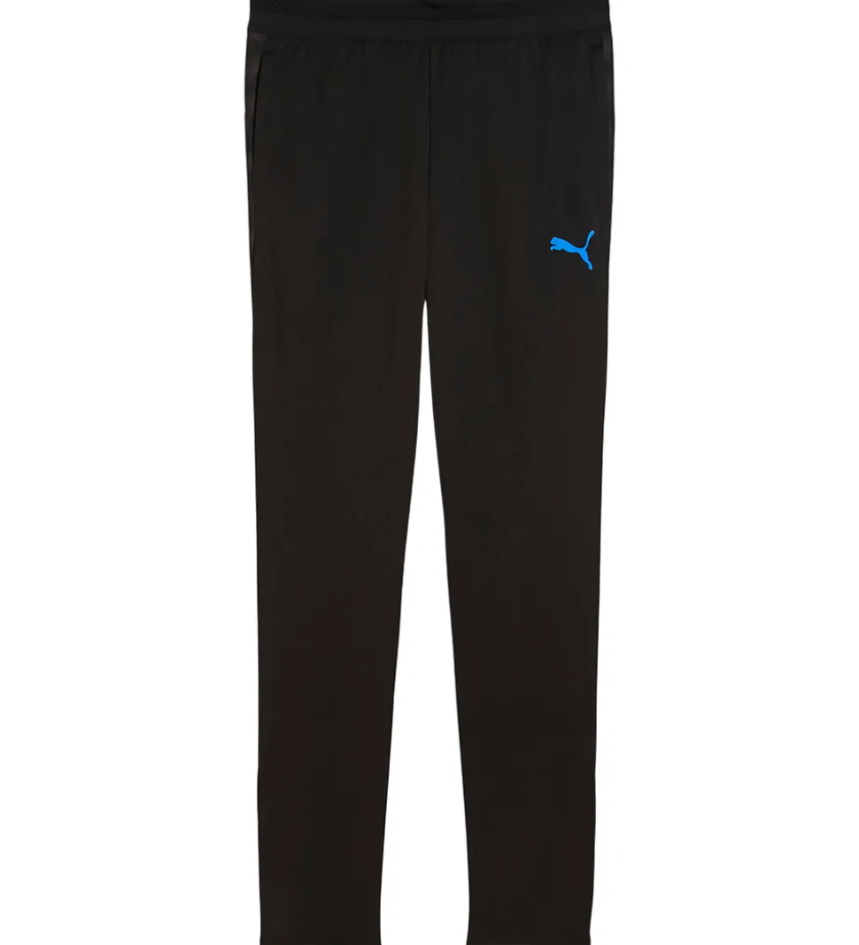Lækre Puma træningsbukser i ensfarvet sort med lille, blåt Puma-logo. Puma træningsbukserne har lange, tætsiddende bukseben med en kort lynlås i bunden. I livet har de en bred elastikkant, som kan strammes ind med en snøre på indersiden. I siderne er der praktiske lommer, som lukkes med en lynlås. Træningsbukserne er lavet i glatvævet kvalitet med en åndbar meshstruktur.