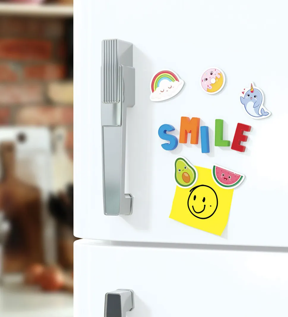 Sjov Quercetti magneter i flotte farver med magnetiske bogstaver, tal, matematiske symboler og nuttede motiver. I æsken medfølger:
