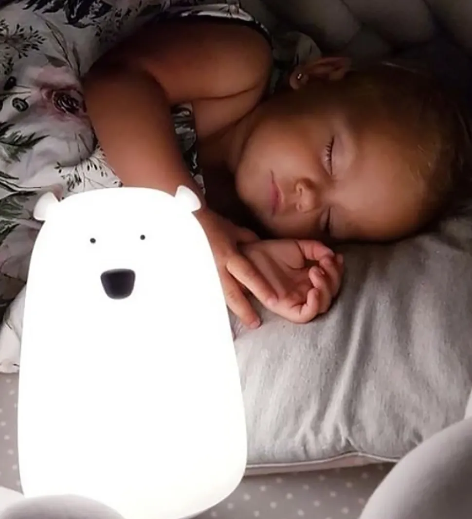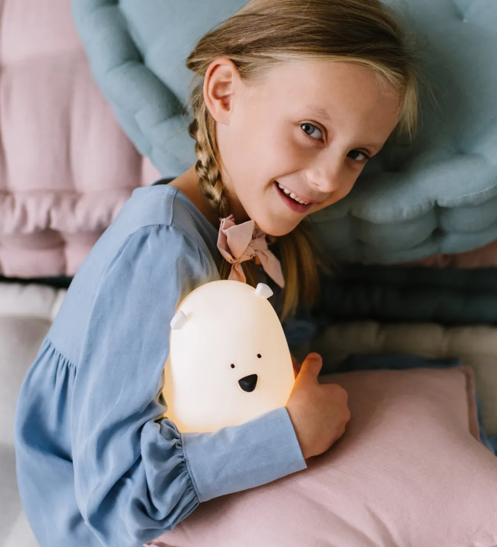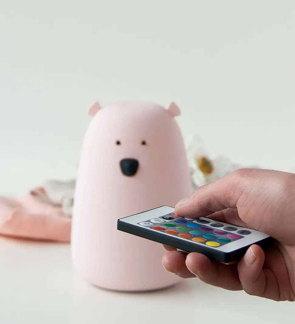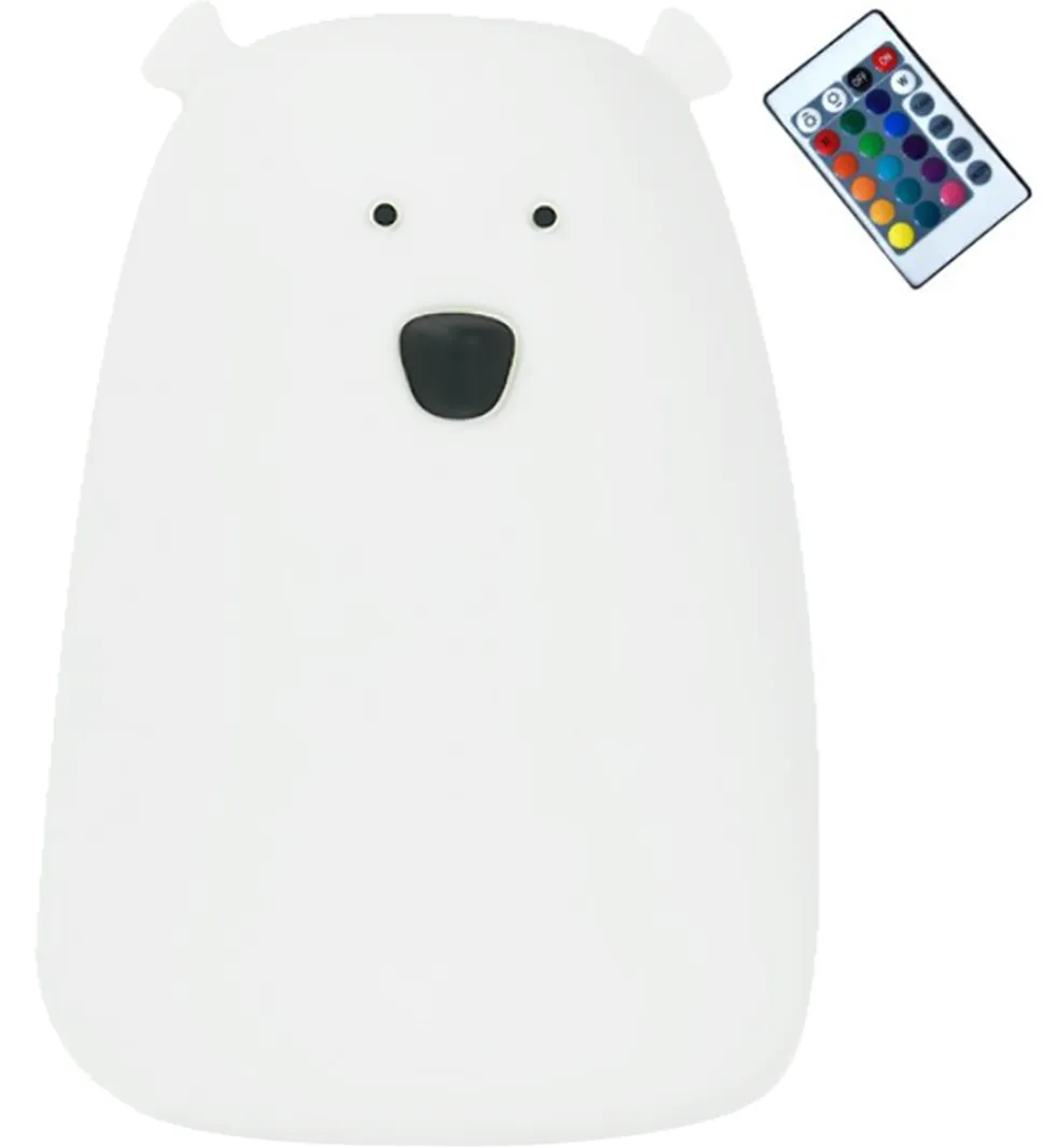 Smart Rabbit & Friends lampe i hvid med form som en bjørn, med søde ører og ansigt samt medfølgende fjernbetjening og opladerkabel.