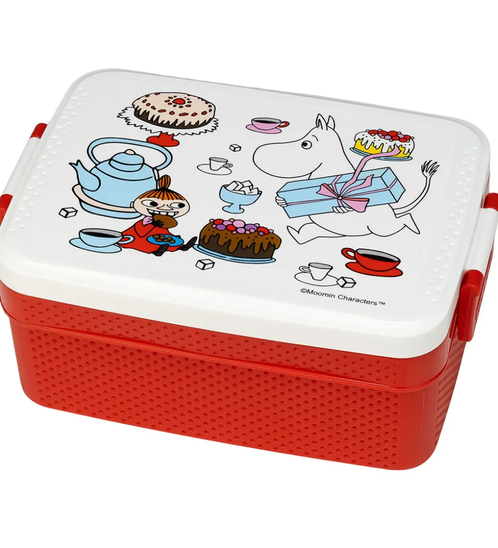 Smart Rätt Start madkasse i rød med en struktur af små prikker og med et hvidt låg, der har et farverigt Mumi-print.