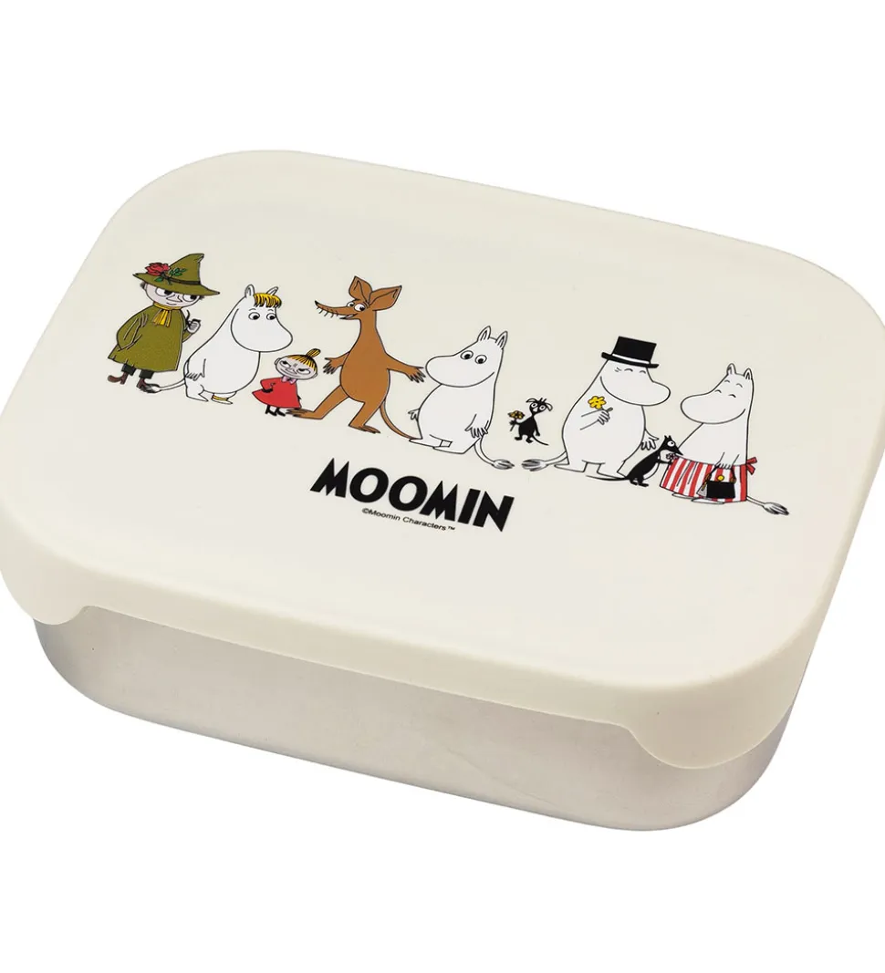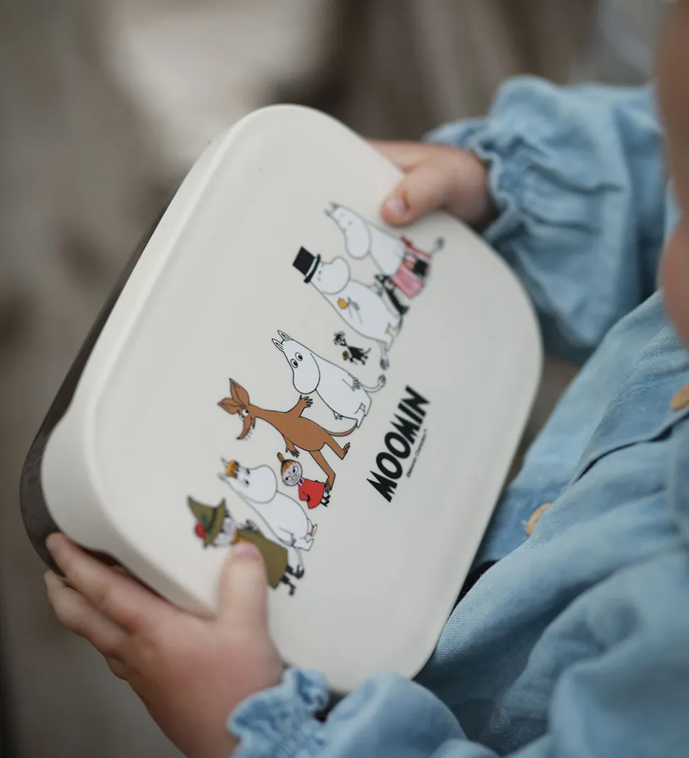 Skøn Rätt Start madkasse med et beige låg, der har print af karaktererne fra Mumitroldene.