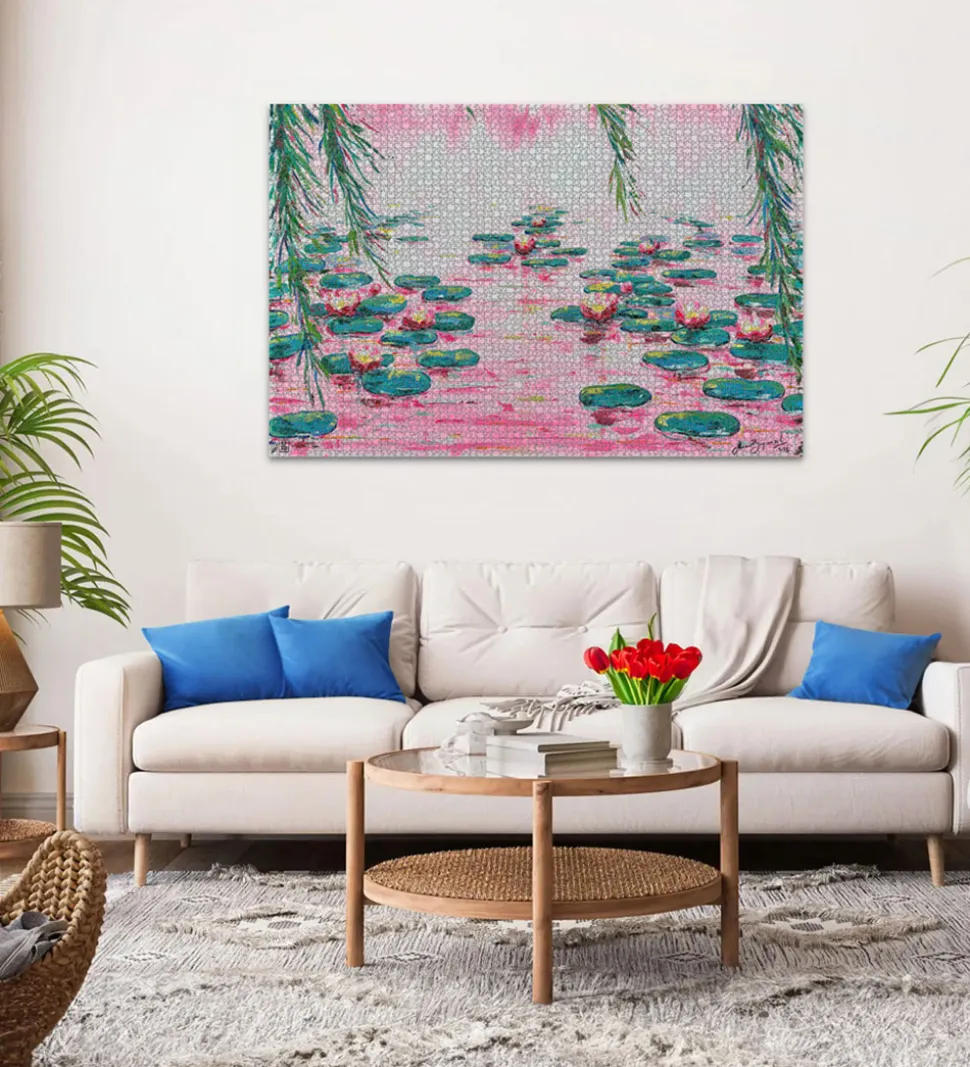 Flot Ravensburger puslespil med et flot motiv af en sø med åkander og hængende grene i primært rosa og grønne nuancer.