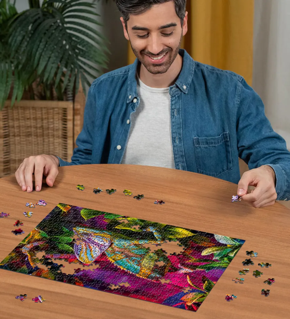 Fascinerende Ravensburger puslespil med motiv af en farverig kamæleon.