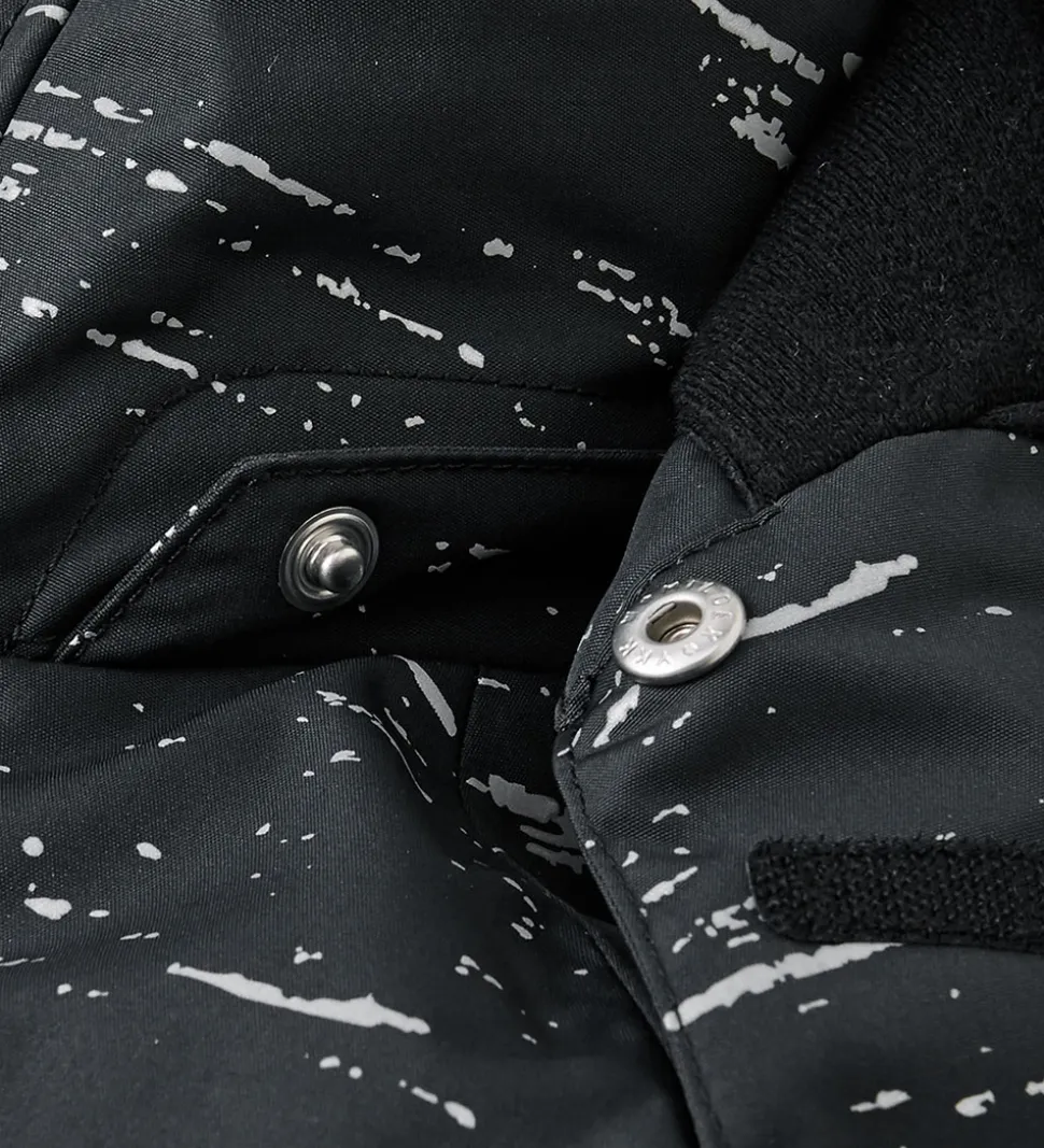 Reima flyverdragten har en aftagelig hætte med elastikkanter i siderne, som sidder fast med skjulte trykknapper, og den lukkes foran hagen med velcro. Ærmerne har fleeceforede elastikkanter, og buksebenene har elastikkanter og aftagelige, justerbare gummistropper til at sætte under støvlerne.