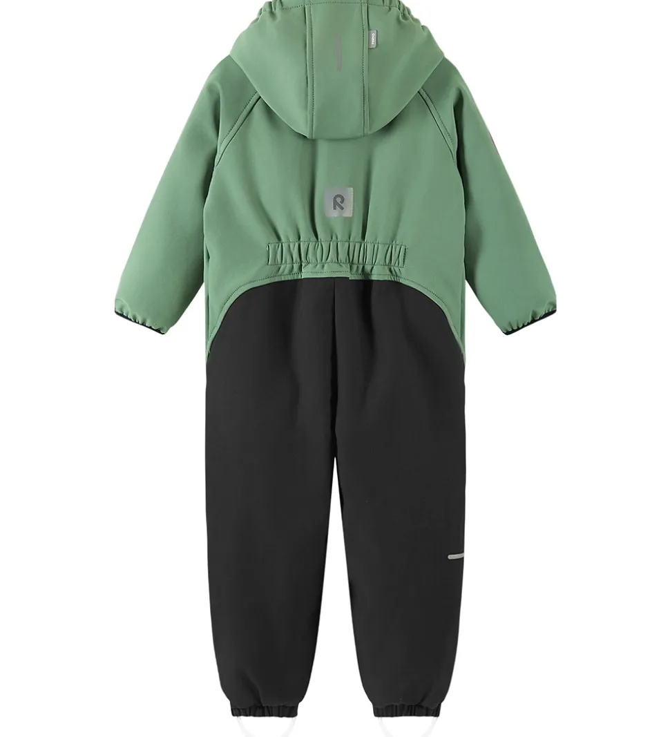 Skøn Reima softshelldragt i støvet grøn med hvide lynlåse og et dejligt, blødt fleecefor indvendigt.