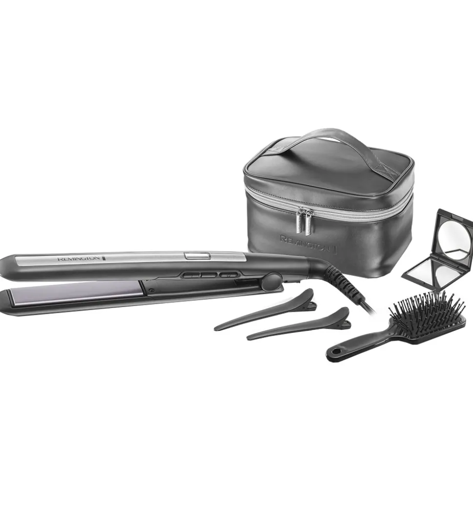Smart Remington glatteejern i modellen PRO-Ceramic Titanium, som er sort og sølv, og der medfølger tilbehør i form af en toilettaske, to klips til at dele håret i sektioner, en hårbørste i rejsemodel og et lille spejl.