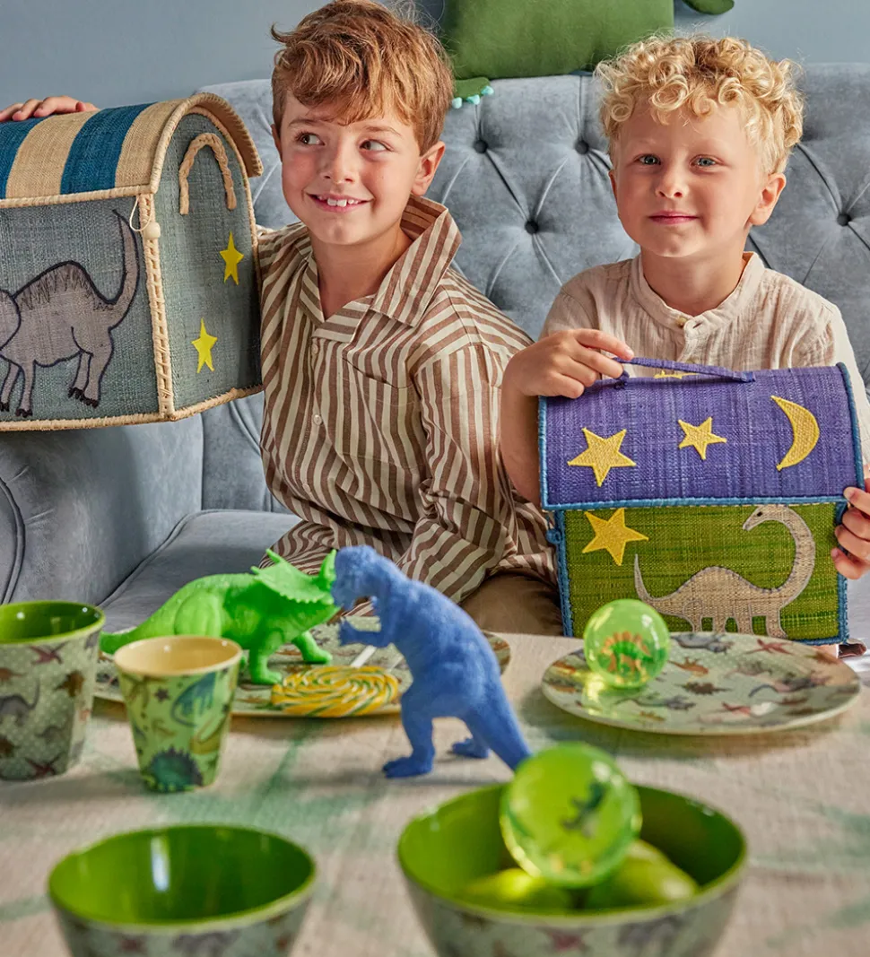 Sød Rice opbevaringskurv lavet som et hus og udsmykket i et grønt og blåt dinosaurtema med gule stjerner og en måne.