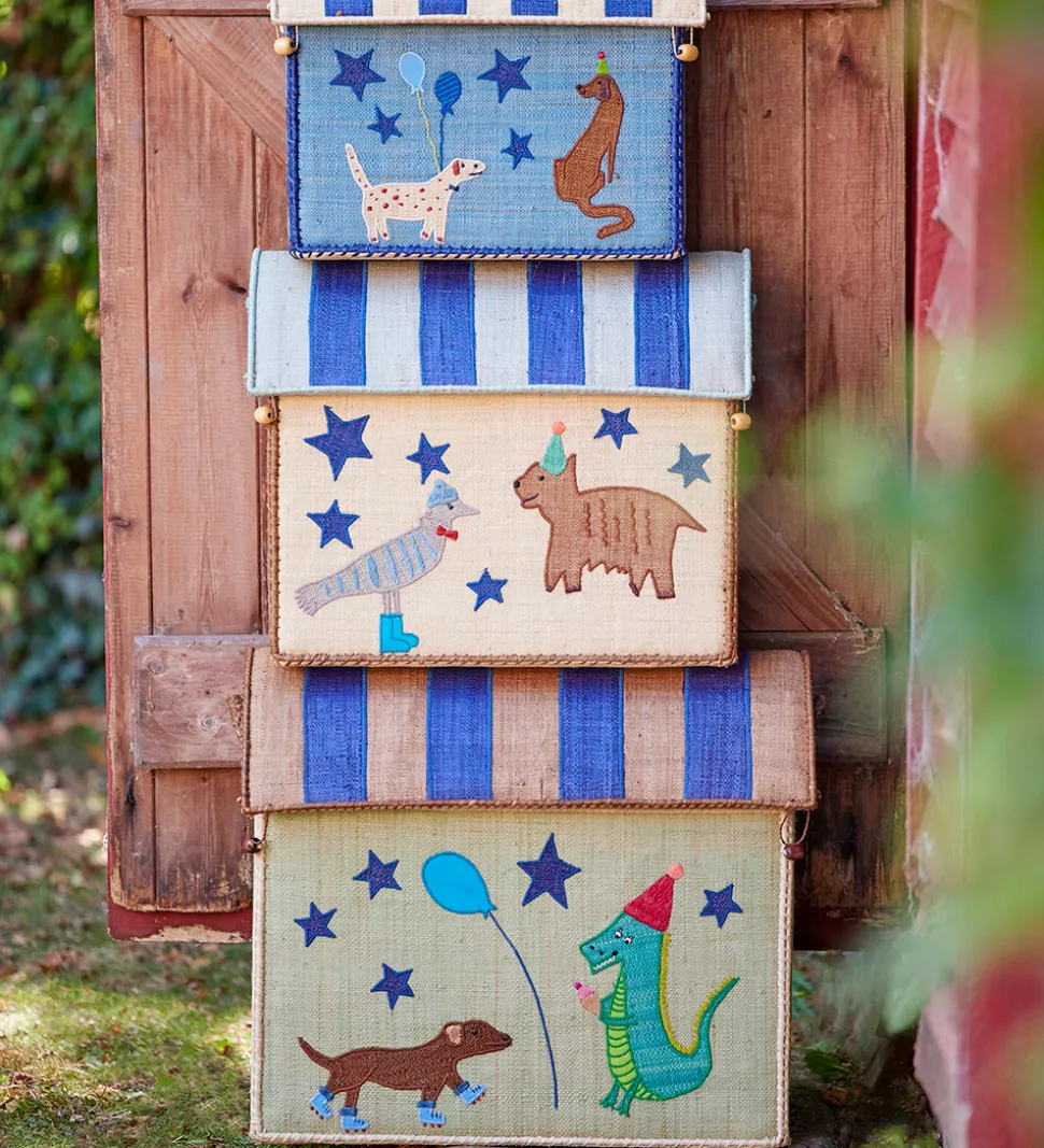 Søde Rice opbevaringskurve lavet som 3 huse, der alle er udsmykket i et dyretema med flotte farver.