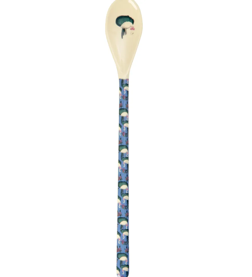 Stilfuld Rice ske i cremehvid med et blåt skaft med svaner og et skehoved med print en svane.