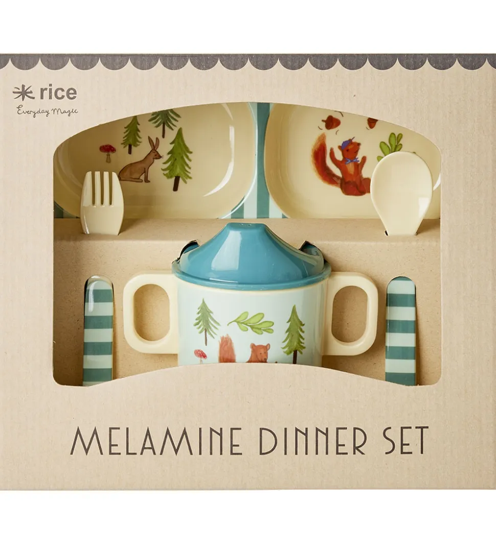 Cool Rice spisesæt med blå og lyseblå striber og skovprint. Med i sættet følger: