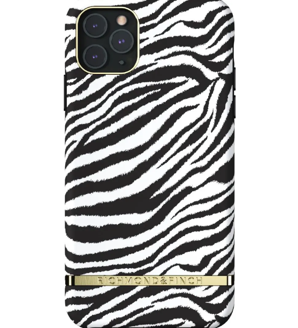 Lækkert Richmond & Finch mobilcover i et sort og hvidt zebramønster med en smuk guldkant omkring kamerahullet og en guld logokant nederst på coveret.