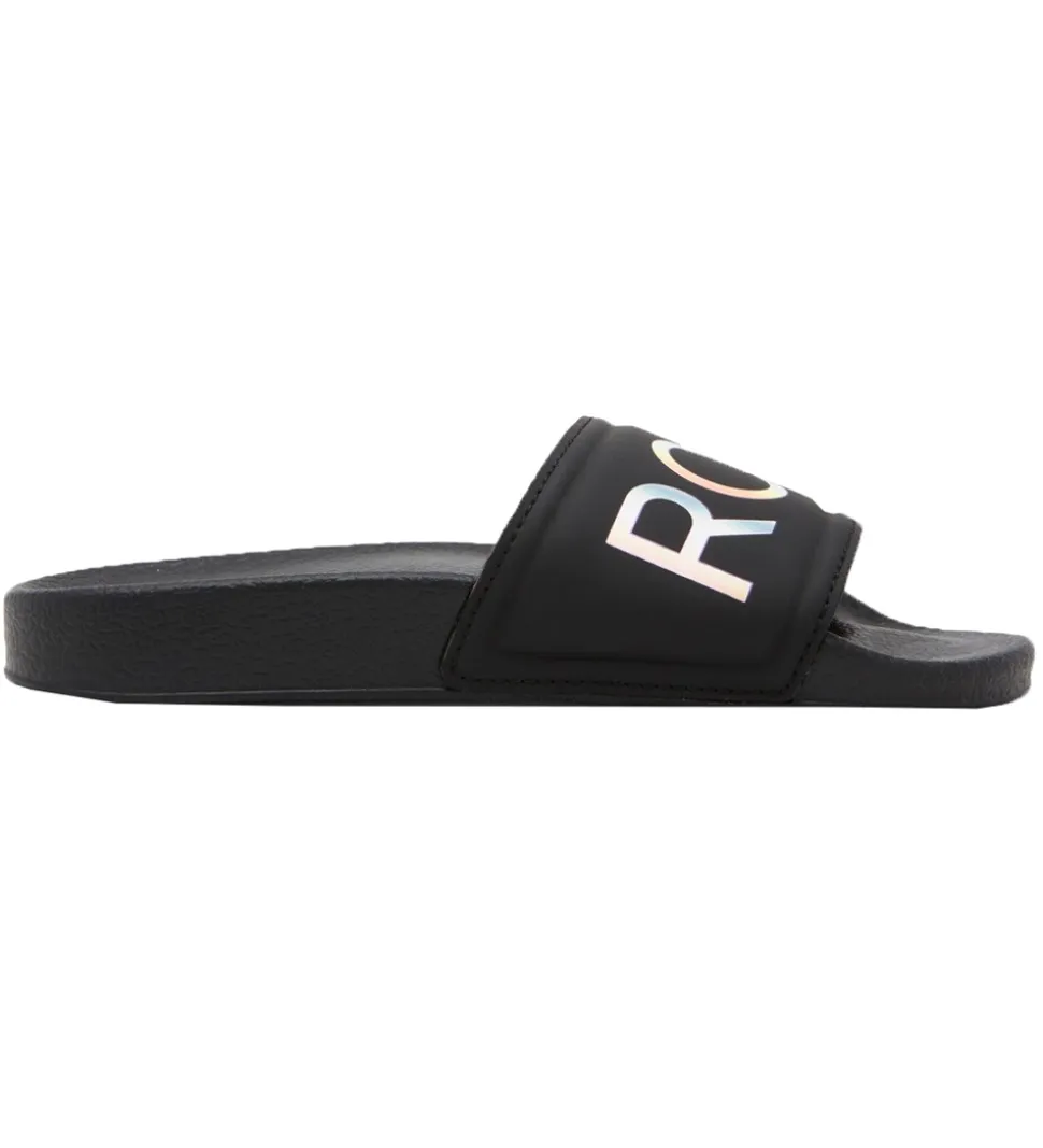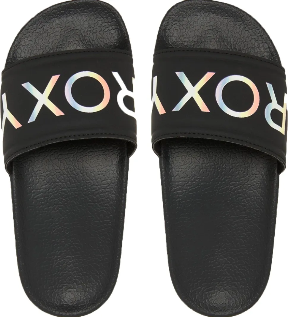 Flotte Roxy badesandaler i sort med “ROXY” i flere farvet på remmen.