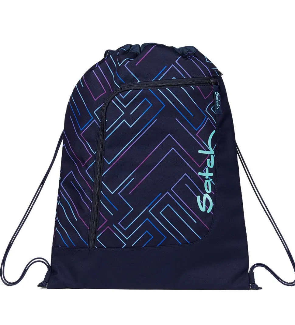 Satch gymnastikposen lukkes til i toppen ved at stramme snørerne ind. Fortil er der et mindre rum, som lukkes med en lynlås. Gymnastiposen kan klikkes fast uden på skoletaskerne fra Satch med remmen med klikspændet i toppen af tasken.