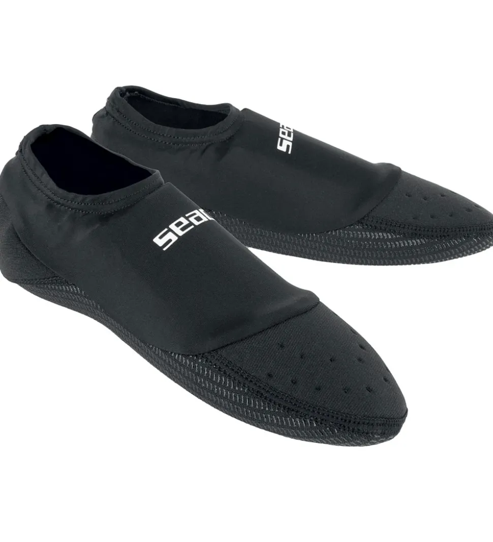 Seac badestrømperne trækkes let på og holdes på plads af en elastikkant i åbningen. Bunden er polstret og har en skridsikker struktur, så man kan gå både sikkert og behageligt. Badestrømperne er i hurtigttørrende neopren.