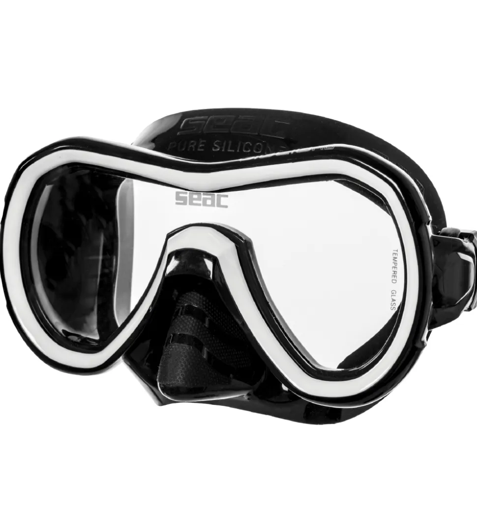Seac dykkermasken har én linse med panserglas, og det bløde skørt med næse er i allergivenligt silikone, mens rammen er af polykarbonat. Dykkermasken justeres i siderne ved hjælp af praktiske spænder, der sikrer en let tilpasning, så dykkermasken sidder tæt.