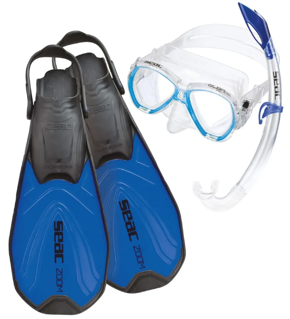 Skønt Seac snorkelsæt med svømmefødder i et blåt farvetema.