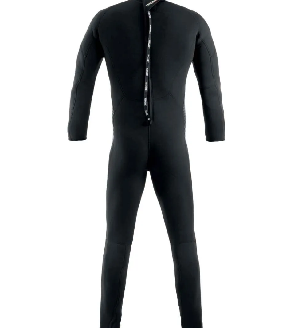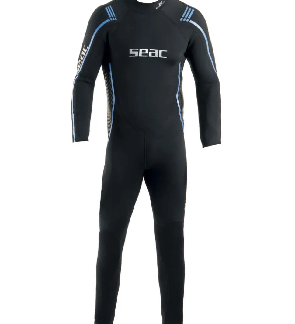 Seac våddragten har en rund hals, lange arme og ben og åbnes ned langs ryggen ved hjælp af en lynlås med et langt vedhæng. Våddagten kan tages af og på uden besvær takket være det meget strækbare og letvægtige materiale.