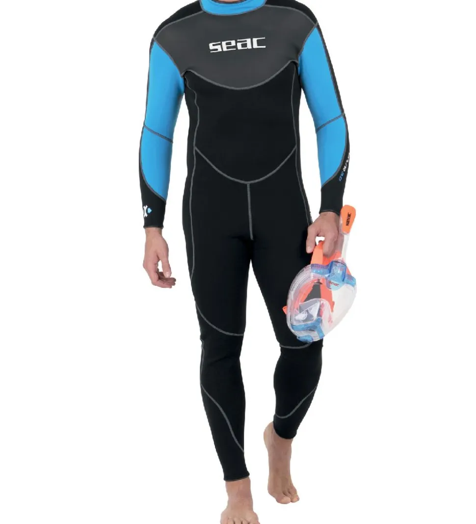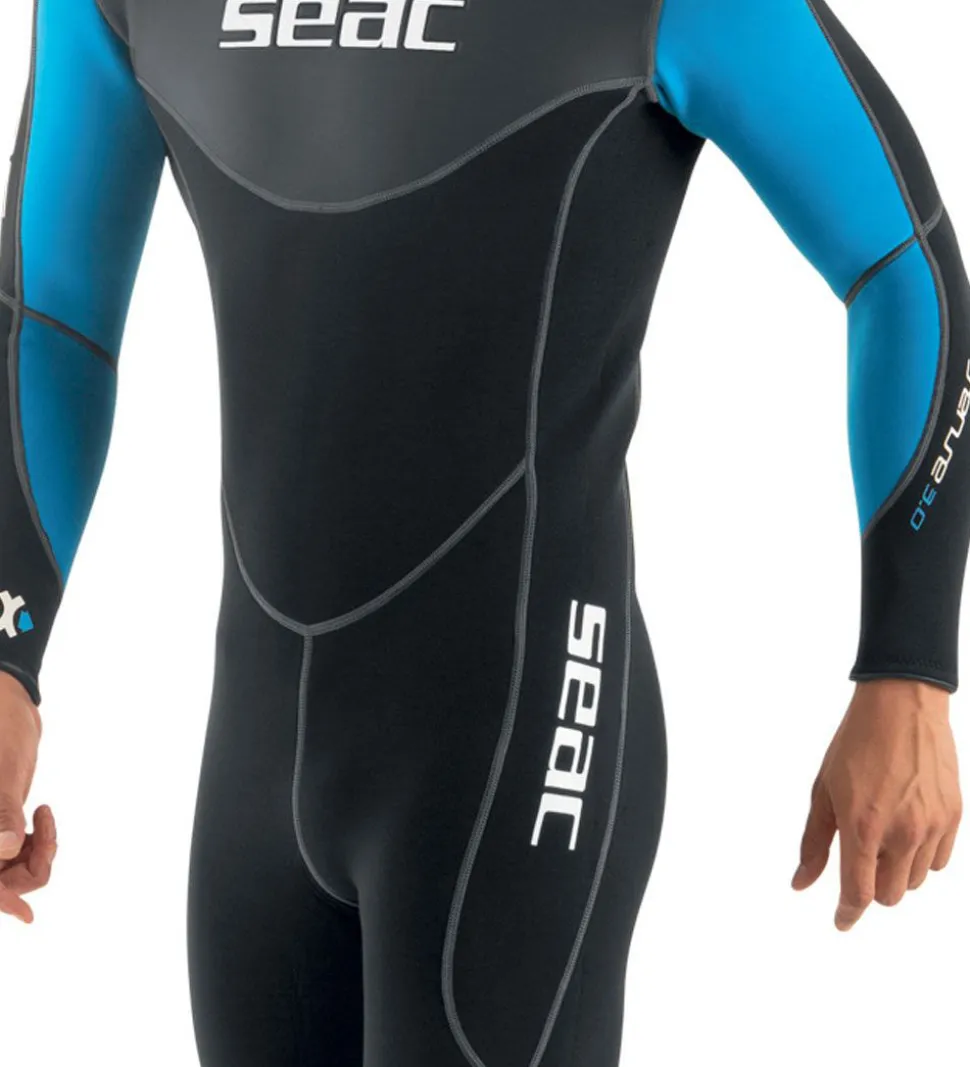 Lækker Seac våddragt i sort med blå detaljer og hvide logoer. Våddragten er fremstillet i blød og behagelig neopren, som er et fleksibelt materiale, og denne våddragt er perfekt til aktiviteter som svømning, dykning og sport i varmere vand.