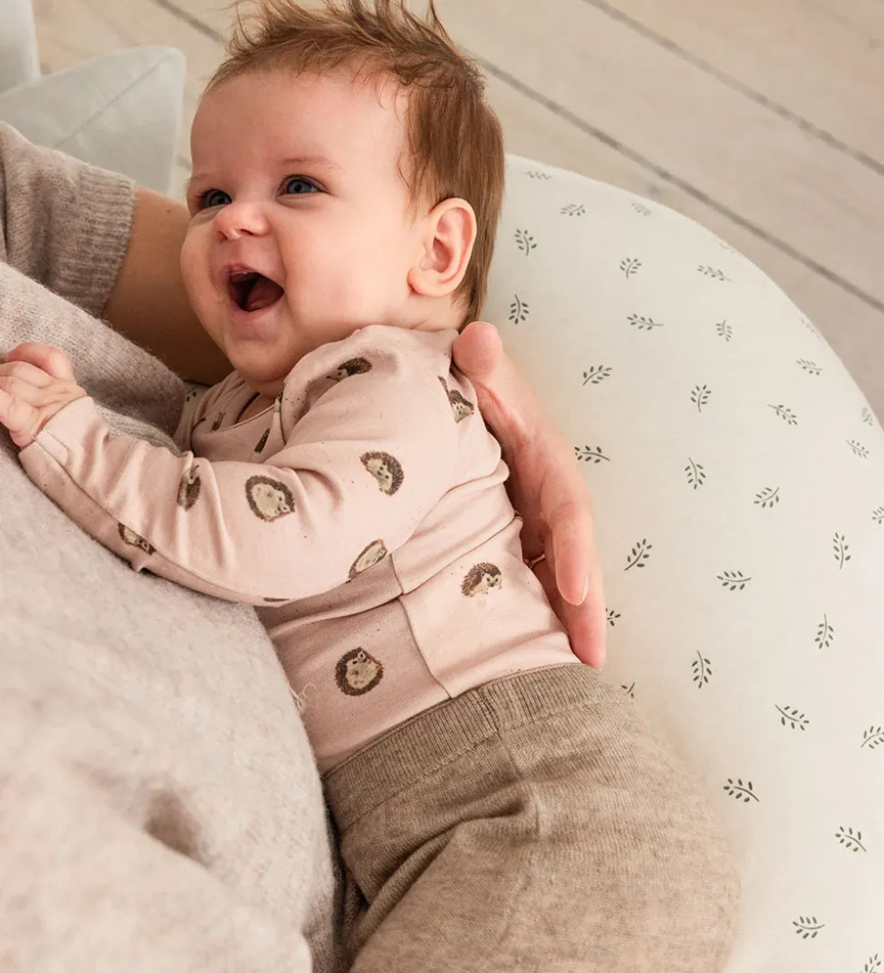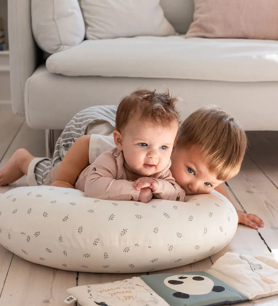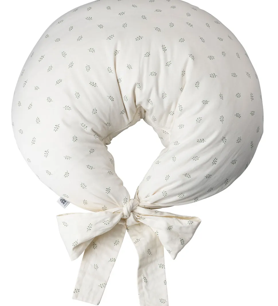 Praktisk Sebra ammepude i hvid med et fint print af blade i støvet grøn.