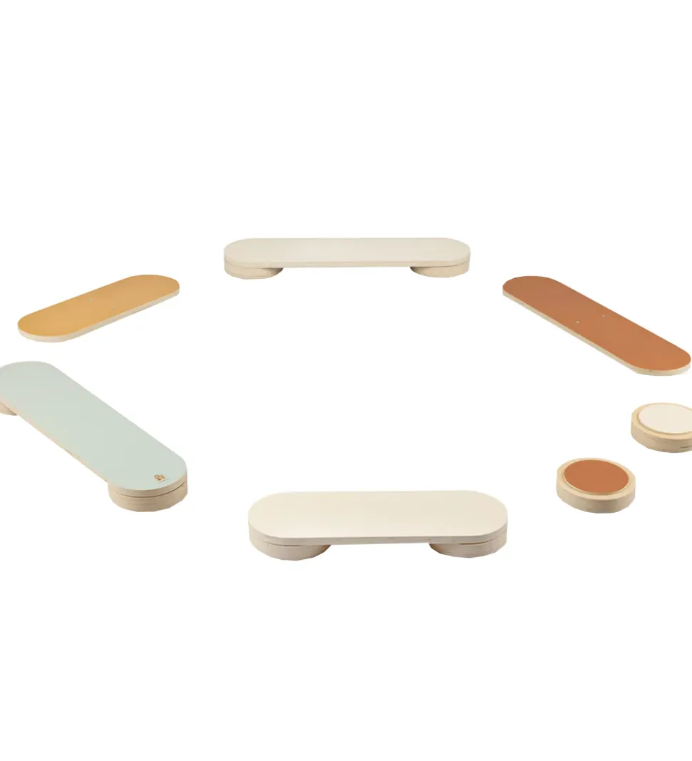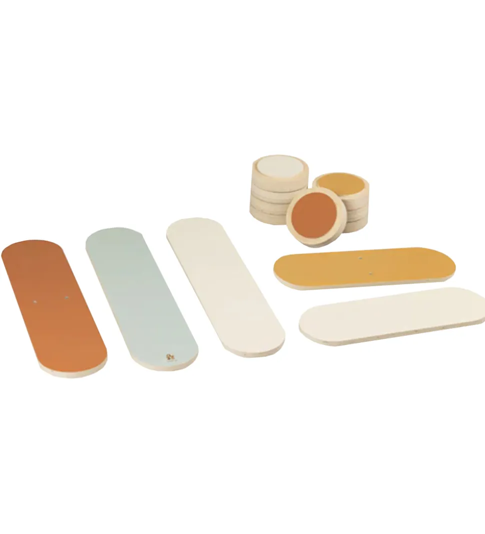 Sebra balancebanen består af 3 lange plader med en buet underside, 2 korte plader og 8 runde trædesten. Nu kan der bygges en sjov balancebane, hvor man selv bestemmer sværhedsgraden.