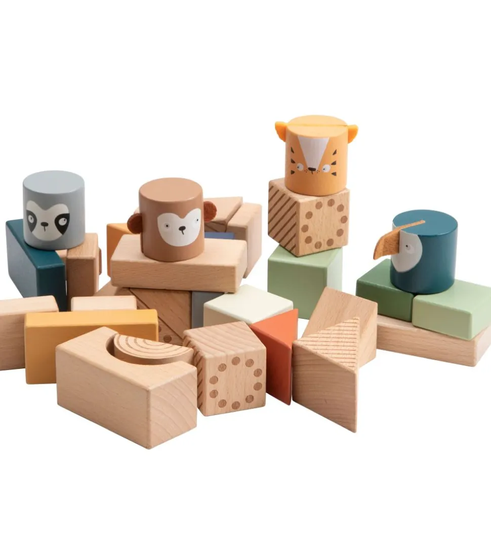Skønt Sebra byggeklodser i farvet træ med byggeklodser i firkanter, trekanter, broer og dyrehoveder – aben Maci, tigeren Tupi, tukanen Tully og dovendyret Lacey.