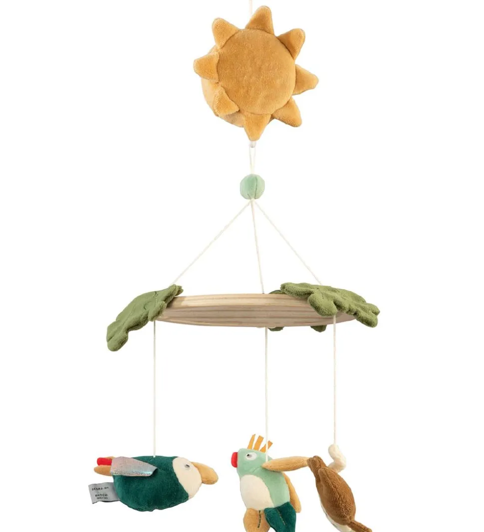 God Sebra musikuro bestående af en cirkel i træ, med tre vedhæng af forskellige dyr under bunden og tre blade i toppen. I toppen hænger uroen fast i en gul sol.