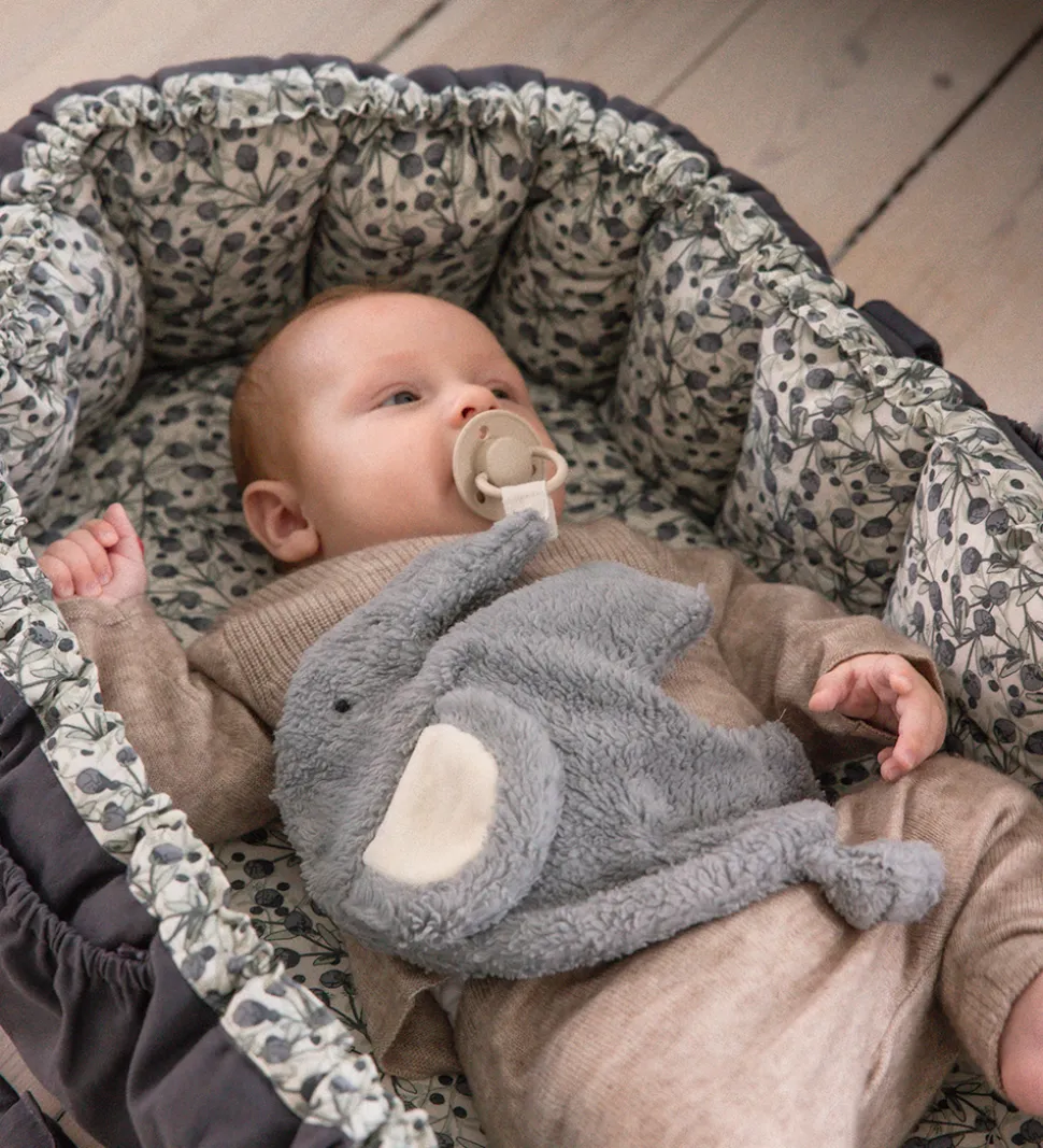 Skøn Sebra nusseklud i gråblå plys med form som en elefant. Nussekluden er blød og dejlig at putte med. I snablen er der en lille velcrorem, som kan bruges som sutteholder. Nussekluden bliver hurtigt en kær følgesvend for de mindste.
