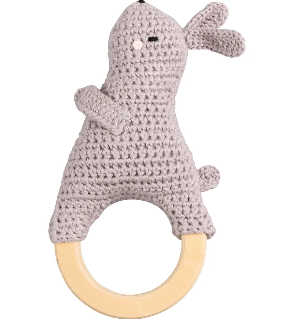 Sebra ranglen består af en træring med afrundede kanter, og en hæklet kanin på toppen med en indvendig bjælde, som laver en beroligende lyd når ranglen rystes.