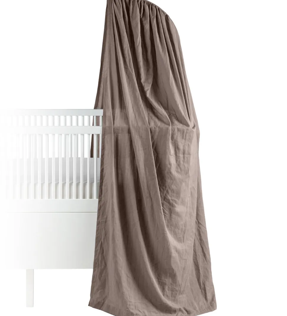 Smuk Sebra sengehimmel i lysebrun. Sengehimlen er dobbyvævet med diskrete, dekorativer striber i vævningen.
