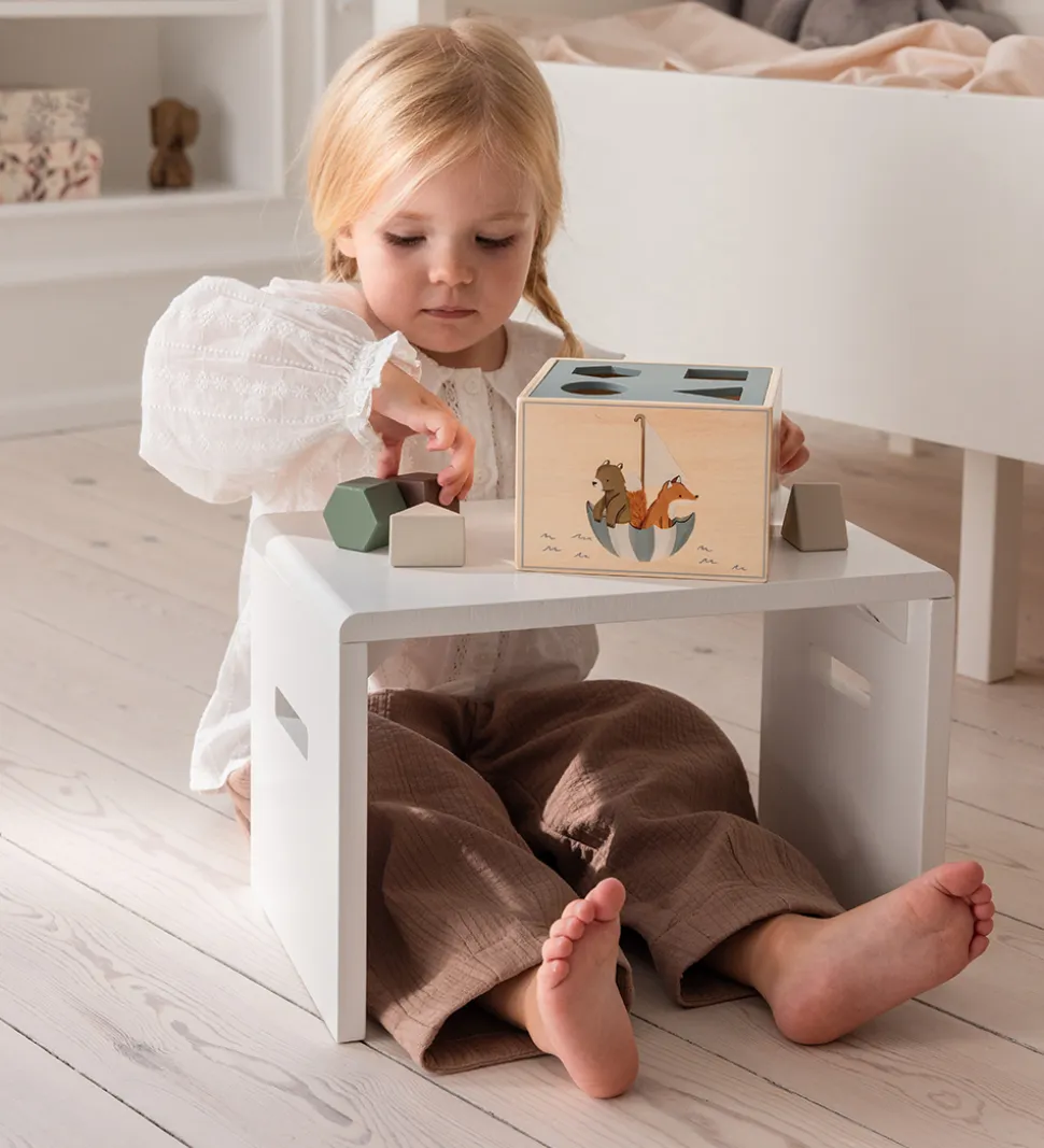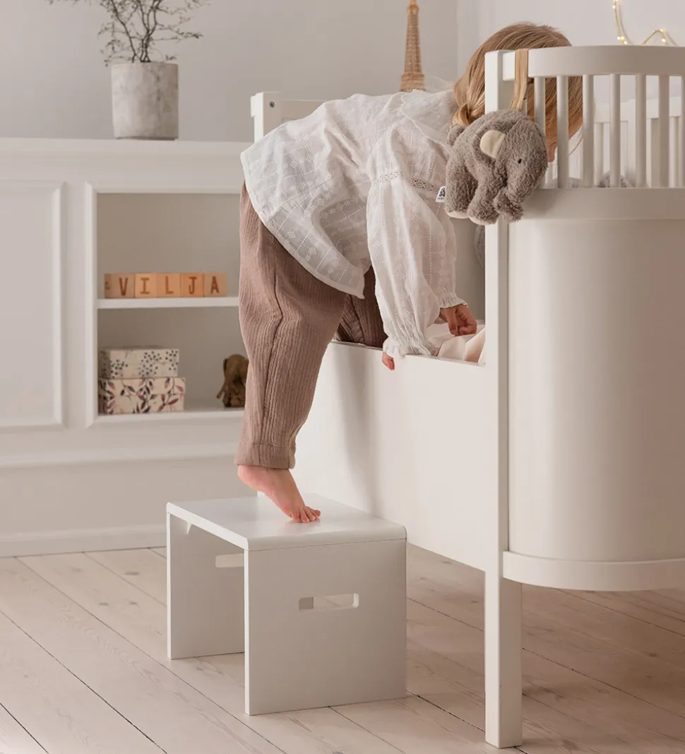 Skamlen har et praktisk håndtag i hver side og er designet til at gøre det nemt for barnet at kravle op i Sebra Sengen, Baby & Jr., når tremmerne er taget af siderne. Derudover kan den bruges som en skammel i køkkenet eller på badeværelset eller som et lille bakkebord. Skamlen er stabil og der medfølger silikoneklistermærker, som kan sættes under bunden, for at gøre den skridsikker og beskytte gulvet. Skamlens multifunktionelle og enkle design, gør den både praktisk og flot at have stående.