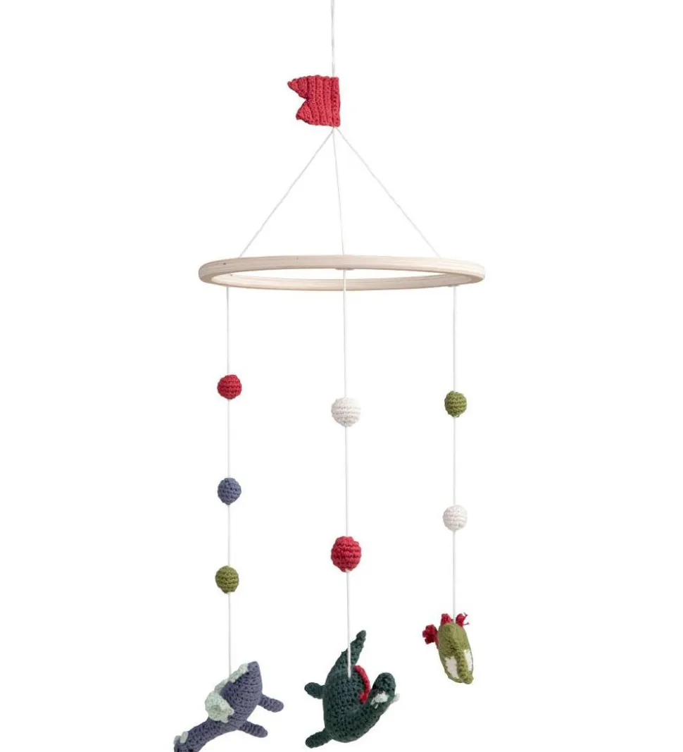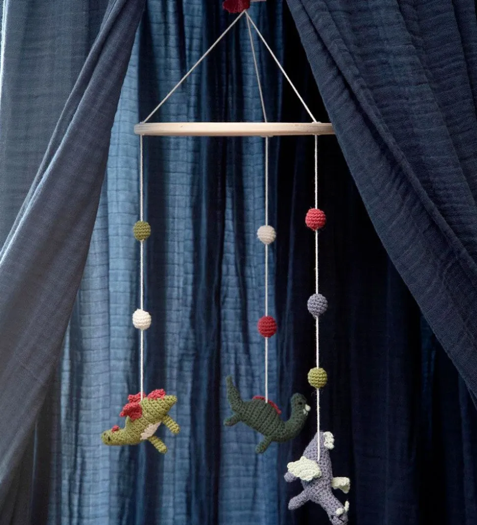 Sebra uroen består af en træring og tre forskellige drager, hver med hæklede kugler på snoren. I toppen er der et hæklet flag og en løkke, så den er let at hænge op over puslebordet, kravlegården eller over sengen.