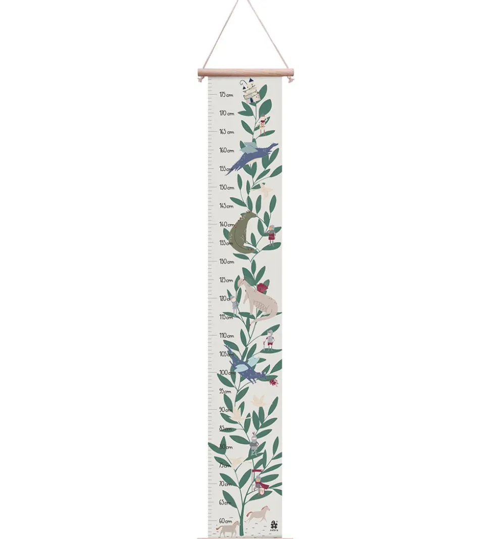 Sebra vægdekorationen er lavet som en højdemåler med centimetermål fra 56-179 cm. Vægdekorationen består af papir, som er monteret mellem to træholdere, og den hænges nemt op med et søm. Barnets højde kan markeres med en tusch eller med små klistermæker direkte på højdemåleren.