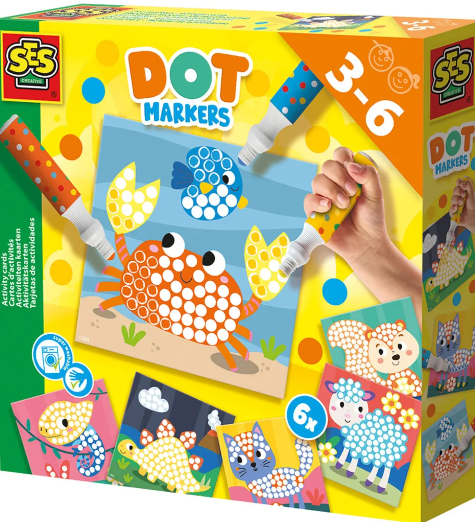 Sjove SES Creative priktuscher i tre forskellige farver. Priktuscherne kommer i en æske med seks tegninger af søde dyr, fyldt med hvide prikker som skal farvelægges. Priktuscherne kan danne forskellige mønstre og tegninger og indbyder til kreativ udfoldelse.