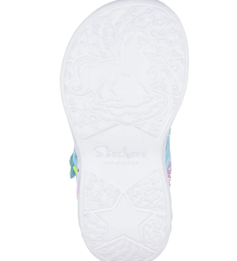 Søde Skechers sandaler i lyseblå, med rosa, lilla og lyseblå nuancer. Ydersålen er hvid med en enhjørning på ydersiden.