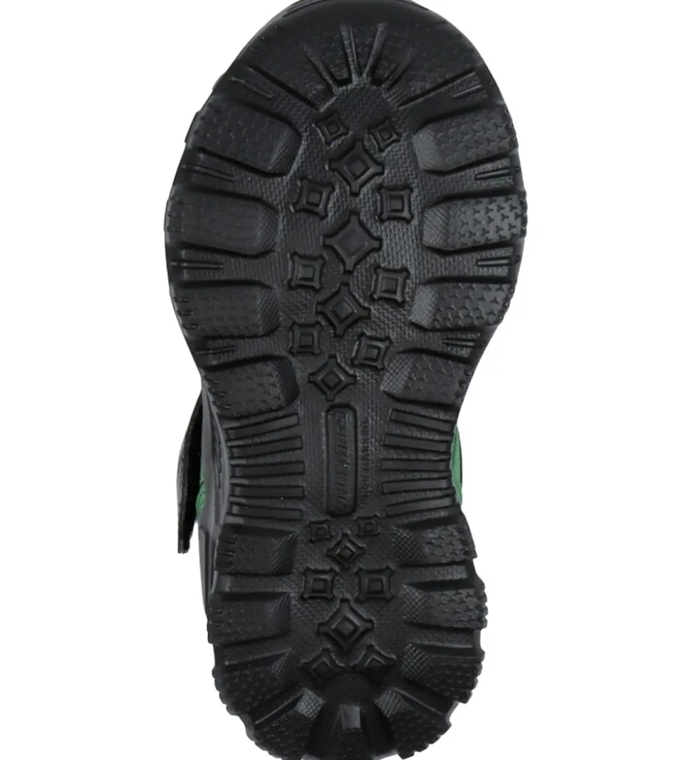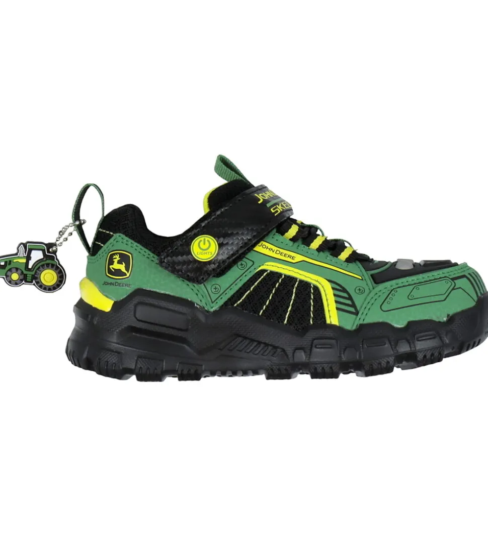 Smarte Skechers sko i grøn og sort med gule detaljer og John Deere logoer flere steder. Ved hælen er der et vedhæng af en John Deere traktor. Skoene har indbygget LED-lyd over tæerne, som blinker rød og orange i forskelligt tempo når barnet går og løber. Lyset kan tændes og slukkes på en knap på velcroremmen.
