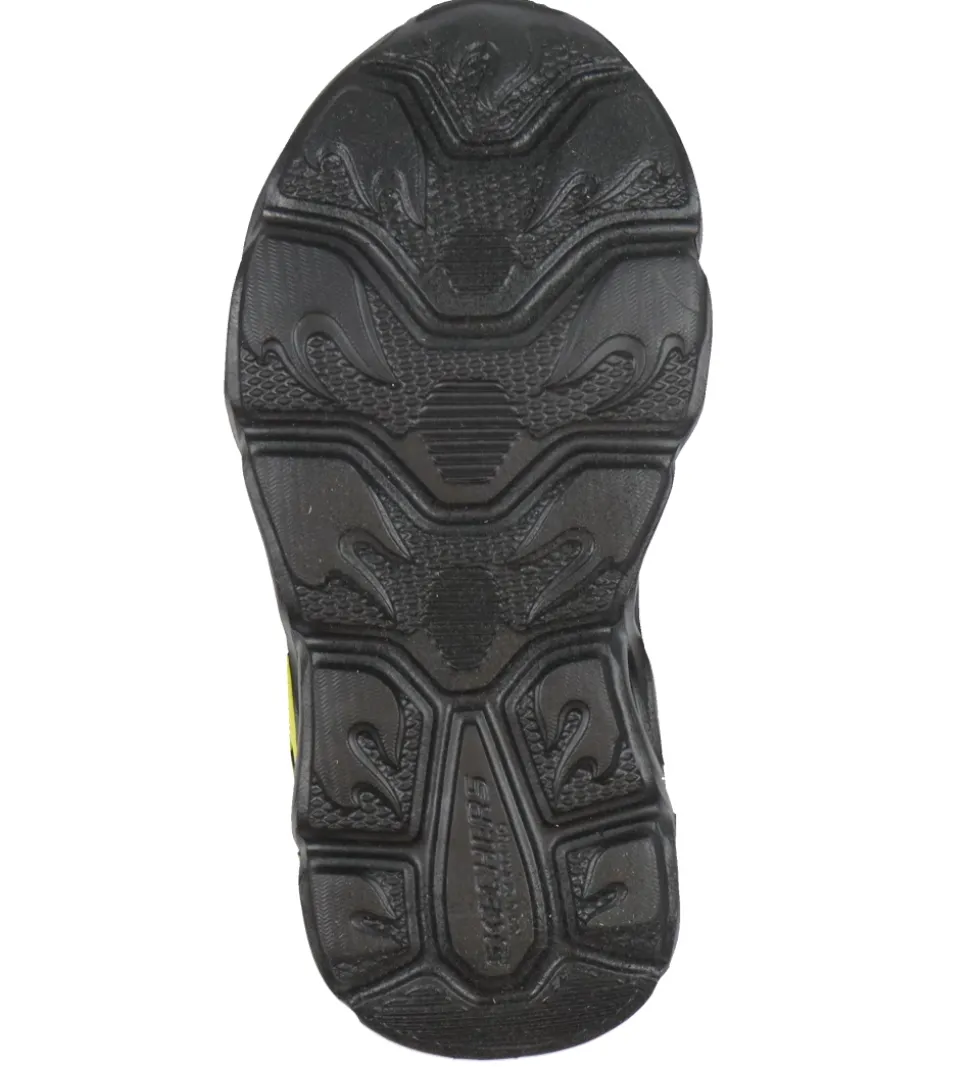 Seje Skechers sko i sort med gule og røde detaljer der forstiller en racerbil. Skoene har blinkende lys i ydersålerne, der aktiveres, når barnet går.