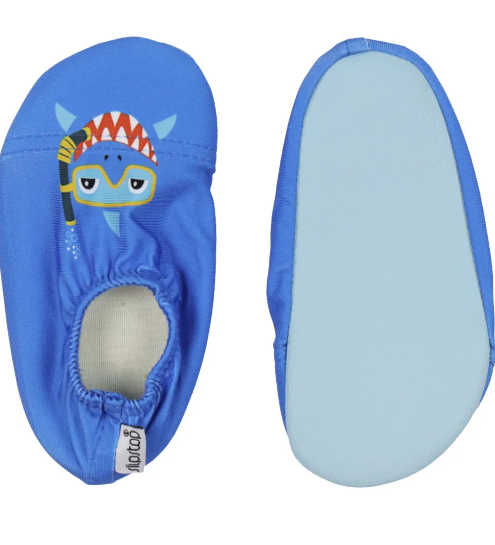 Sjove Slipstop badesokker i blå med print af en haj der snorkler.