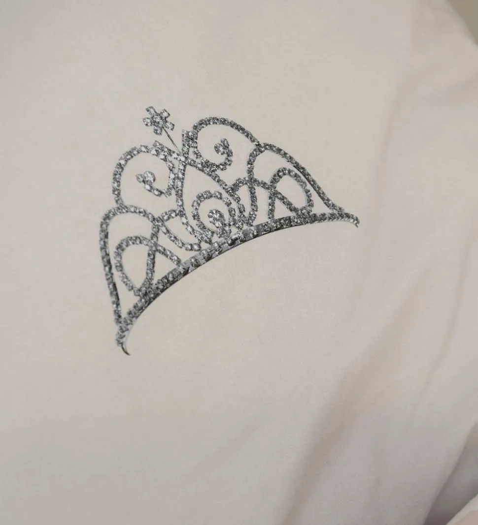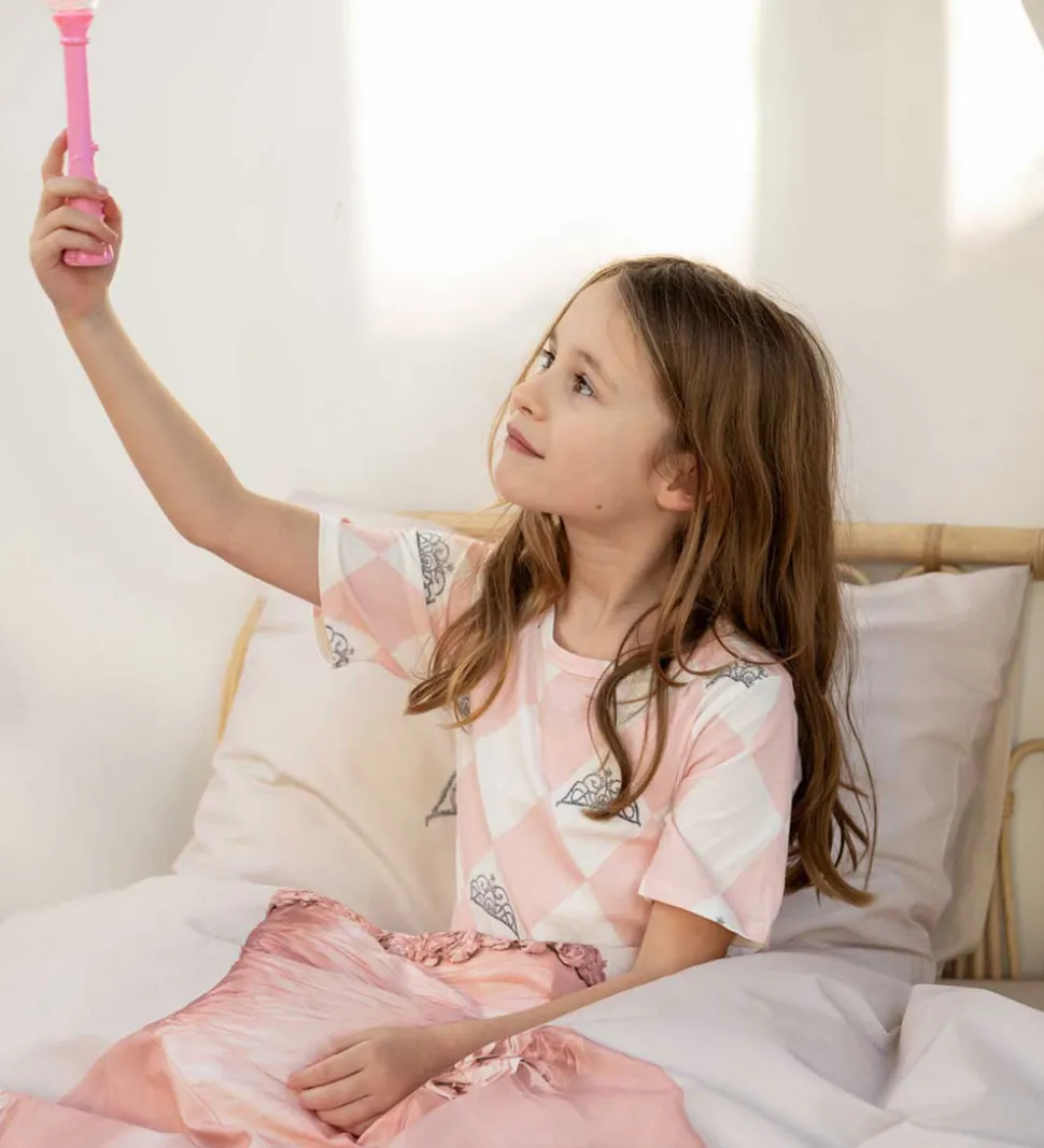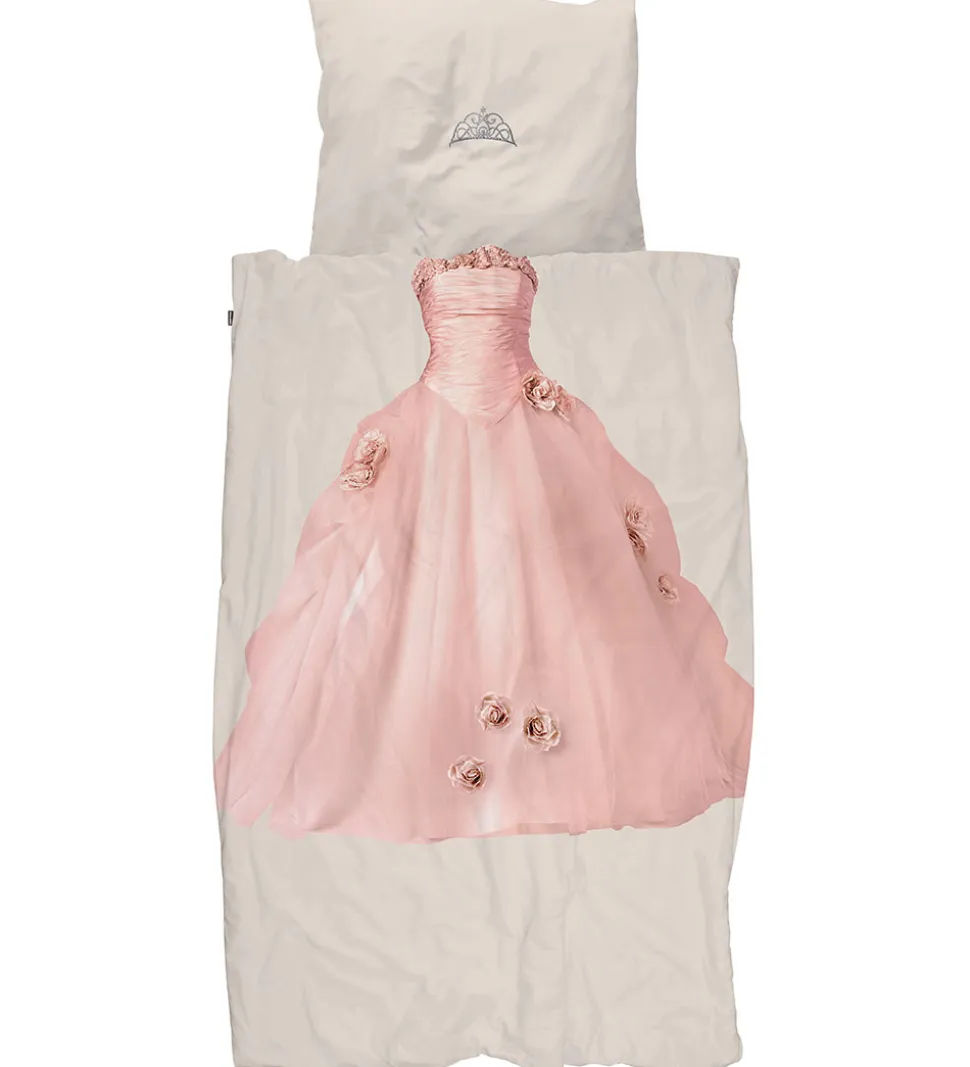Elegant Snurk sengetøj i beige med et rosa print på dynen af en flot kjole dekoreret med blomster og en prinsessekrone på puden. Snurk sengetøjet består af et hovedpudebetræk med foldelukning, og et dynebetræk som lukkes med en lynlås i bunden. Sengetøjet skaber en smuk og drømmende atmosfære på børneværelset.