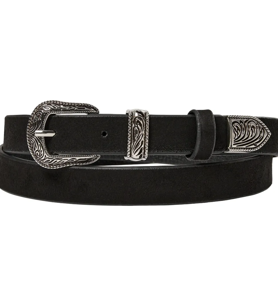 Elegant bælte fra Sofie Schnoor i sort imiteret ruskind med flot dekorerede bæltespænder i sølvfarvet metal.