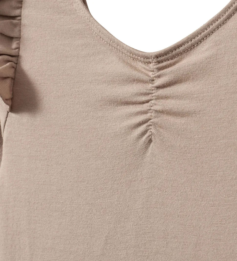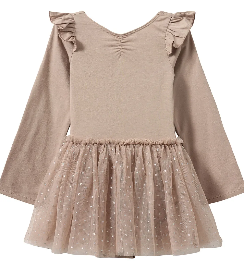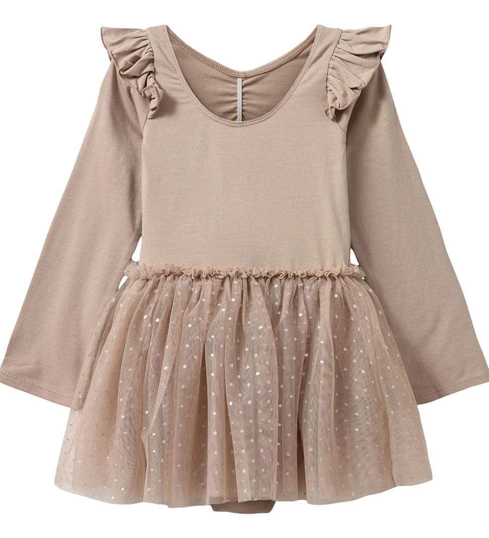 Skøn Sofie Schnoor gymnastikdragt med lange ærmer i en smuk rosa nuance. Dragten har søde flæser ved skuldrene og en flot tylnederdel med glitrende detaljer, perfekt til leg og dans.